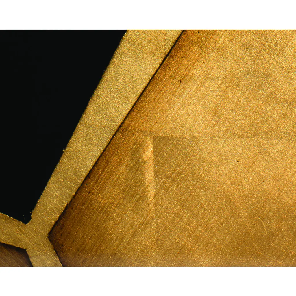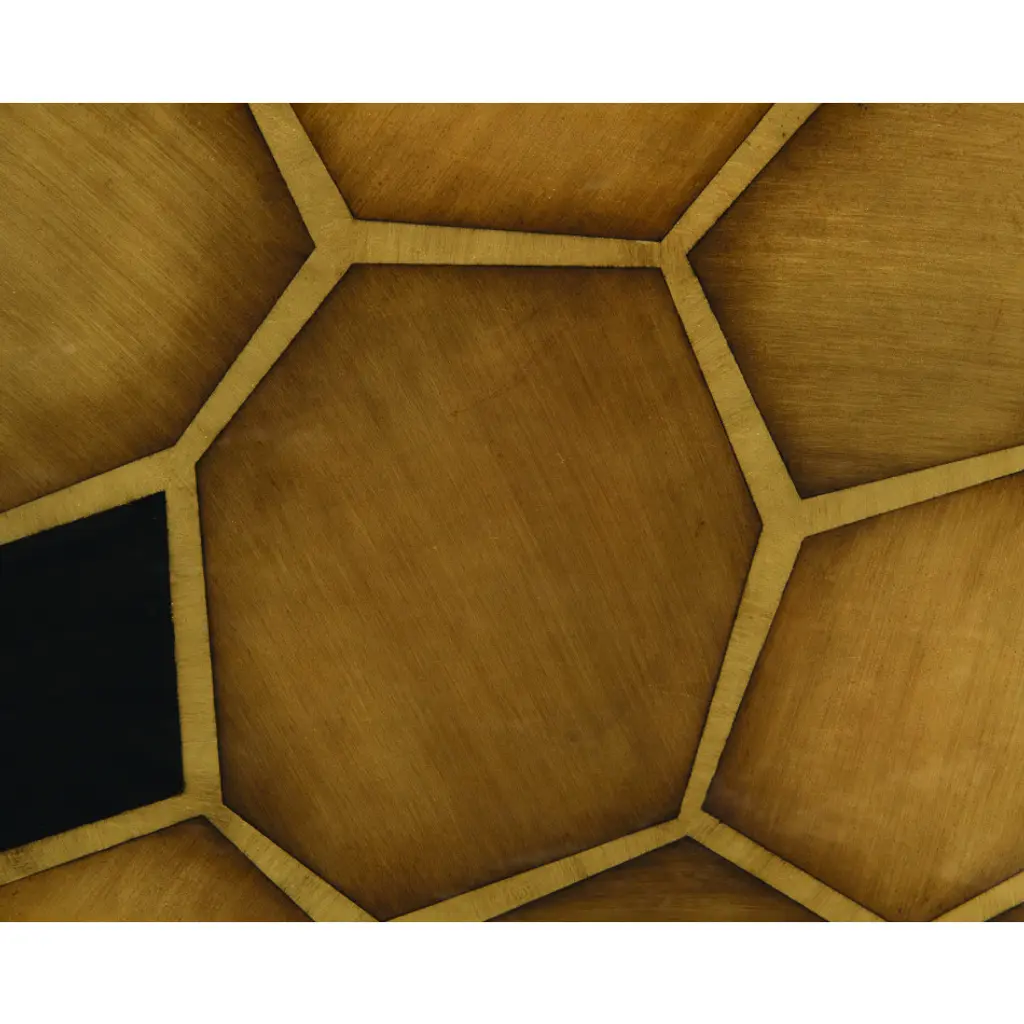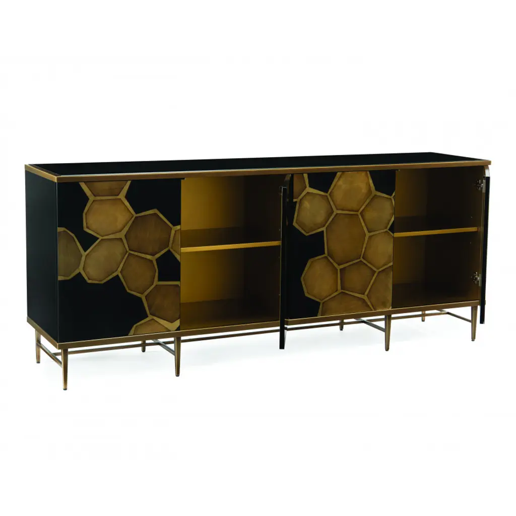 The top and sides of this credenza have inset black glass panels with gold framing, while the doors, also in black glass, have a reverse-painted stylized honeycomb pattern using different shades of gold to add contrast and texture. T