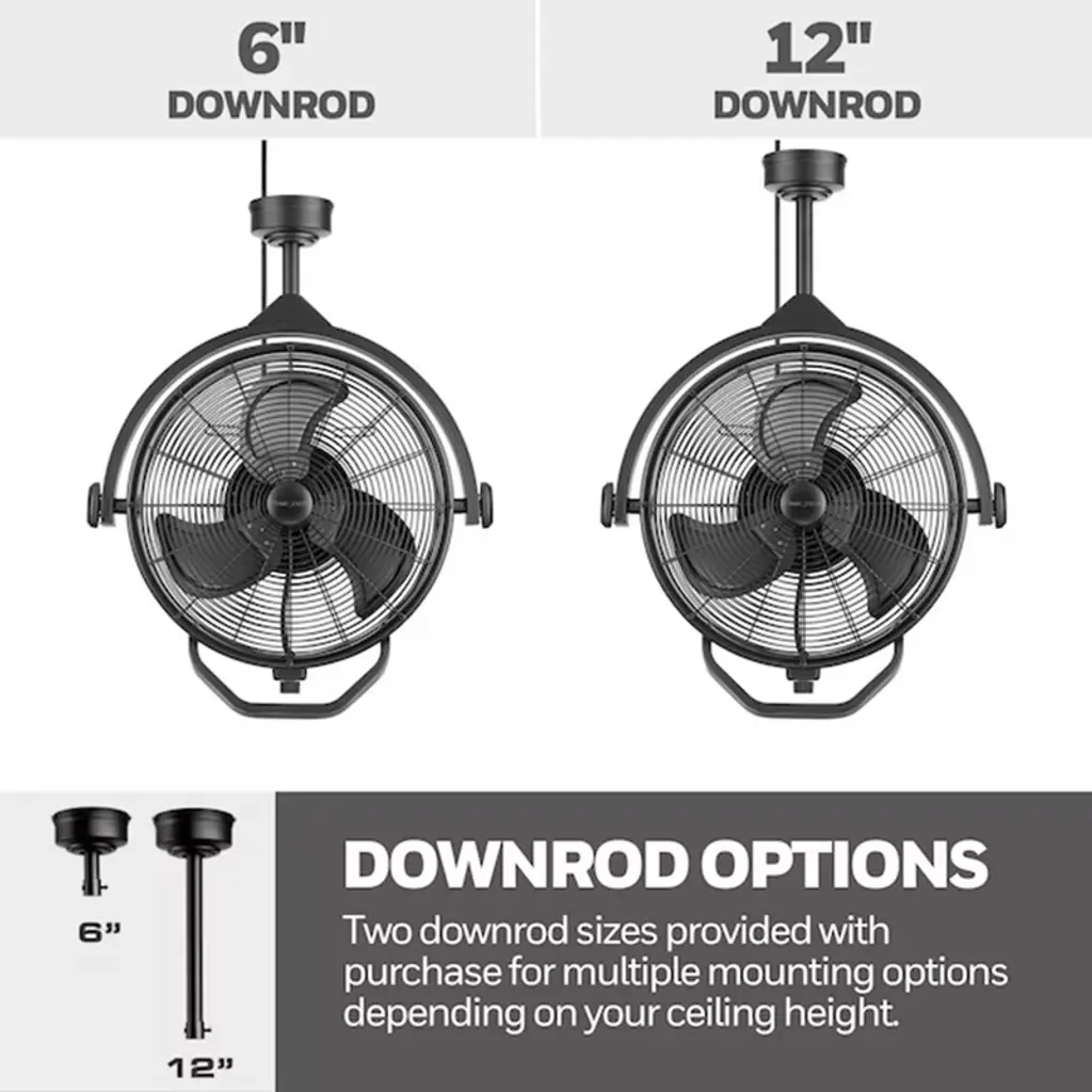 Bring powerful airflow and effortless comfort to your space with the Honeywell Garage Ceiling Fan. This 18 inch fan offers outstanding 3-speed airflow performance, creating up to 5400 CFM to keep your garage, covered patio, or workspace feeling cool and comfortable year-round. Its easy installation design features a universal mounting bracket and a standard 3-prong plug, eliminating the need for hardwiring and allowing flexible placement wherever you need the most circulation. Engineered for versatility, this fan features full 360-degree manual swivel action combined with vertical adjustment knobs, giving you complete control over the airflow direction. Customize your setup further with optional 6-inch and 12-inch downrods, adjusting the fan height to fit your space perfectly. The included 96-inch cord offers ample reach, while adhesive clips make it simple to keep the cord neatly tucked away for a clean, organized look. Built to withstand damp environments, this ceiling fan is ideal for both indoor and covered outdoor use. Whether you're cooling down a workshop, a porch, or a patio, the Honeywell Garage Ceiling Fan delivers reliable performance and a sleek, modern aesthetic. The matte black finish complements a wide range of decor styles, from farmhouse to industrial modern, blending seamlessly into any environment. Designed with durability and convenience in mind, the Honeywell Garage Ceiling Fan combines premium performance with user-friendly features. Enjoy the benefits of powerful airflow, easy plug-in setup, full swivel control, and height adjustability, all backed by a trusted brand known for quality craftsmanship. Upgrade your space with the Garage Ceiling Fan from Honeywell, built for long-lasting comfort and versatile style.