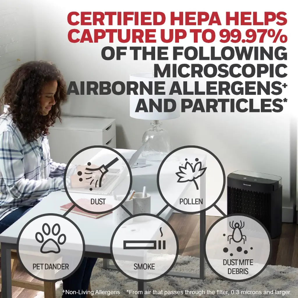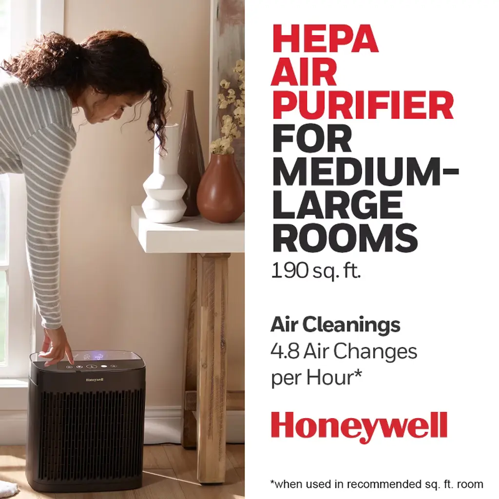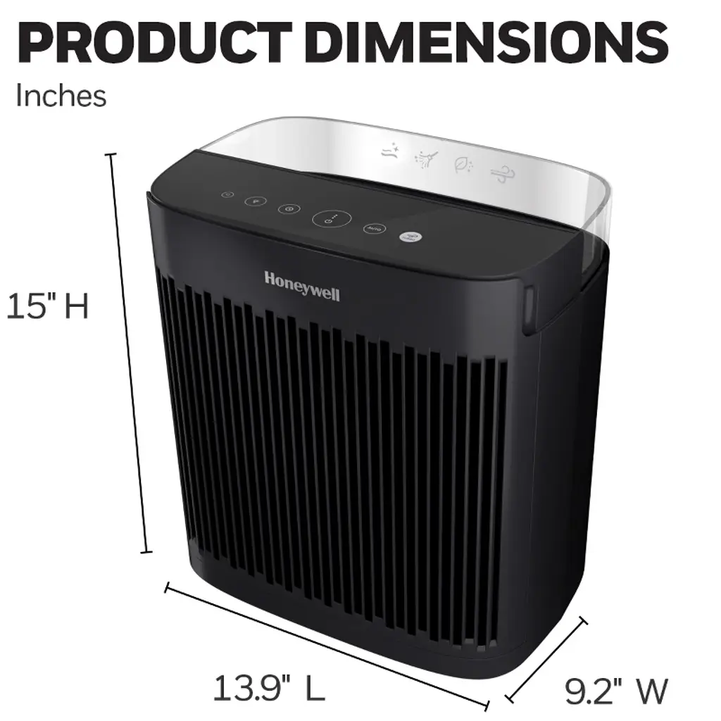 Honeywell HPA5200B Allergen+ Plus Series HEPA Air Purifier console helps provide cleaner, fresher air in large rooms of 360 square feet at 4.8 Air Changes per hour** Or, 1700 sq. ft. at 1 air change per hour.. It includes HEPA Filtration, which helps capture up to 99.97% of the following allergens and particles: dust, pollen, pet dander, dust mite debris and smoke*. This Honeywell air purifier can filter & circulate air up to every 12.5 minutes.** If you have pets or stale indoor air, air purifiers help deliver cleaner, fresher air. The Intelligent Air Quality Sensor continuously displays and monitors air quality. Plus, this air purifier includes Insight® Display at-a-Glace which illuminates to show the 4 cleaning levels, air quality indicator and Auto Mode setting. This quiet air purifier has an auto-off timer option at 2, 4, or 8 hours, and a dimmer option for control panel lights. This Honeywell HEPA Air Purifier is part of our Allergen+ Plus Series. This product earned the ENERGY STAR label by meeting strict energy efficient guidelines set by the U.S. EPA. Always purchase Genuine Honeywell replacement air purifier filters. They are certified to help capture odors and the following microscopic airborne allergens and particles*: dust, pollen, pet dander, dust mite debris and smoke. Other compatible filter replacements are not guaranteed to offer the same performance or efficiency. Recommended filter replacement: True HEPA R Filters 1x/yr. Odor Reducing Pre-Filter A 4x/yr. Disclaimers: * From the air that passes through the filter, 0.3 microns and larger. ** Based on 3rd party independent CADR testing for the smoke CADR value when operated at the highest level. Air circulation depends on many factors, such as room size and configuration. There is no guarantee that all of the air in a room will pass through the filter. +Non-Living Allergens. The ENERGY STAR name and mark are registered trademarks owned by the U.S. EPA.