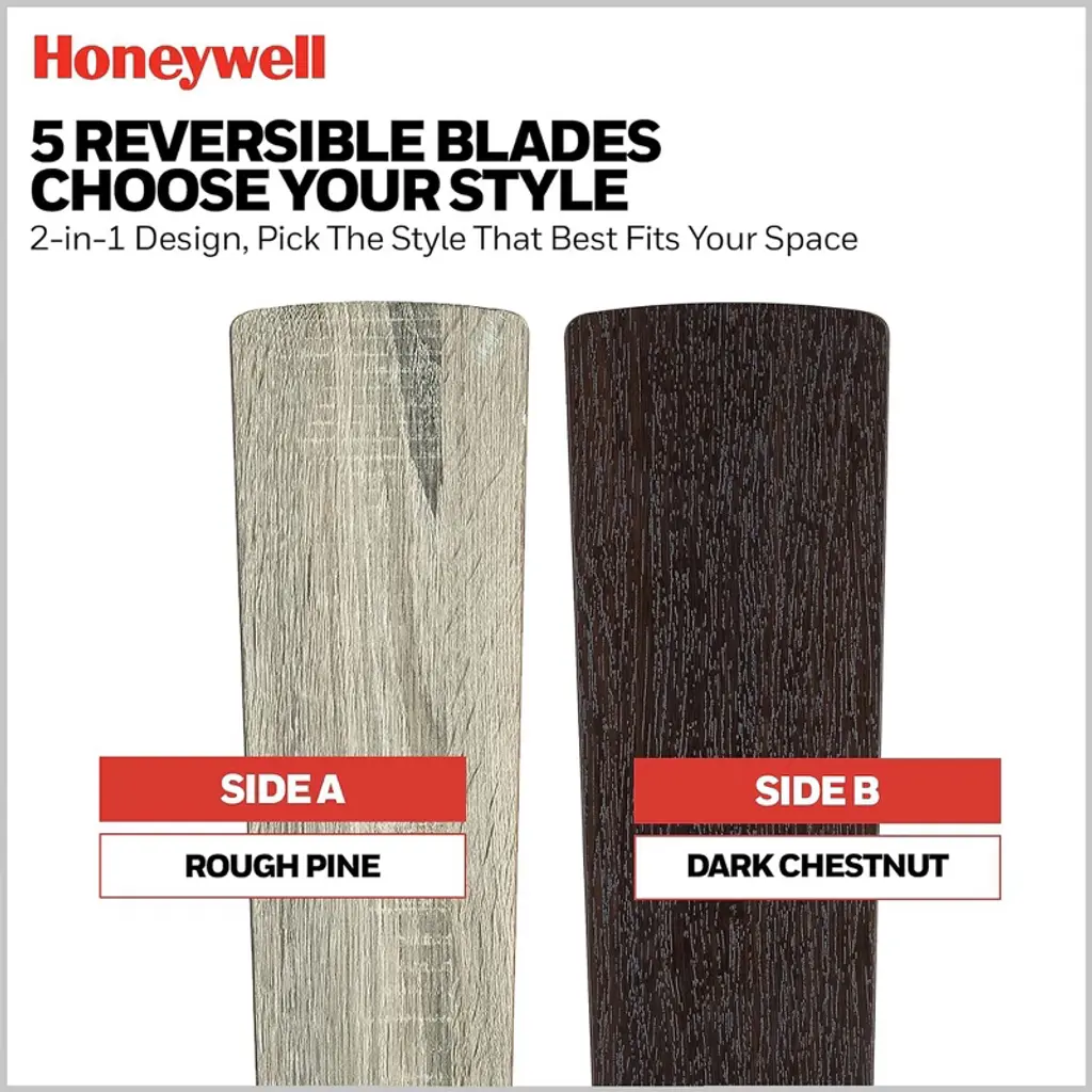 Honeywell ceiling fans make your home comfortable in summer (and winter) as well as help to reduce energy costs. Enjoy the welcome breeze in any room of your home while looking stylish. This industrial multi-position indoor ceiling fan combines stylish details of metal and wood for a truly inspiring fixture for your home. The Myers Park features a lantern style light kit, with clear glass and LED lighting. The innovative 5-blade design provides ultra-efficient, adjustable and energy efficient airflow while the LED lights provide ideal lighting to fit your mood. Control your Honeywell ceiling fan with a touch of a button with our easy-to-use universal ceiling fan remote control with wall mount option (batteries included). Enjoy year-round comfort by adjusting the reversible airflow switch that easily allows you to change the direction of the fan to properly distribute air. During hot summer months it will provide a cooling effect or when reversed, spreading warm air in the winter to help reduce energy costs. Honeywell Ceiling Fans features a collection of fans in various sizes and specifications to ensure your choice of indoor or outdoor fan delivers optimum performance for your room's size. You can trust the quality of Honeywell Ceiling Fans to deliver maximum airflow and a stylish lighting option. Honeywell Ceiling Fans use high-quality materials that are long lasting and durable with satisfaction guaranteed by manufacturer limited lifetime warranty.