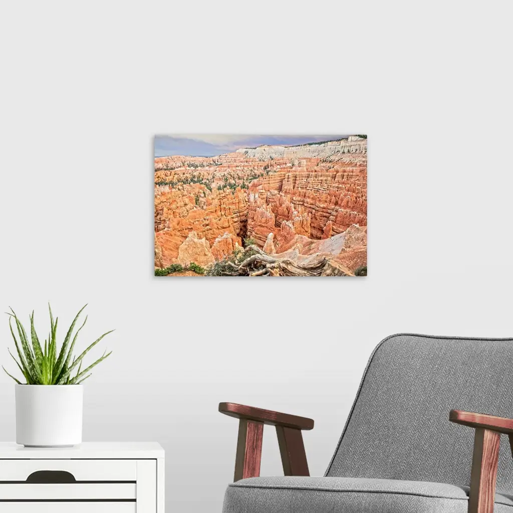 Orange sedimentary rocks form spire-like hoodoo structures in the Bryce Canyon Amphitheater in Bryce Canyon National Park, Utah.