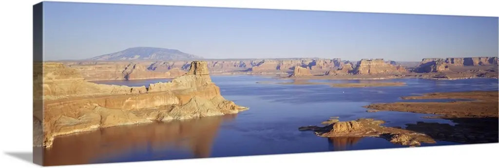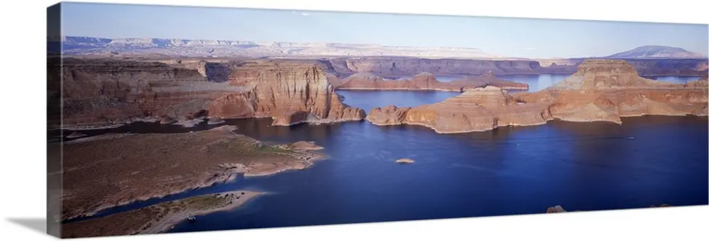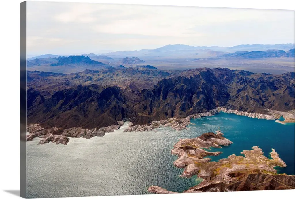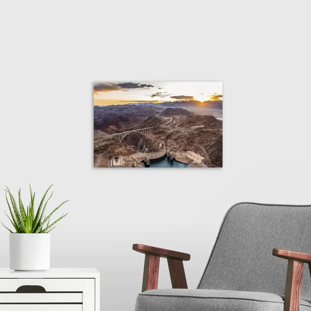 View from above of the Hoover Dam and Lake Mead, with the Mike O'Callaghan-Pat Tillman Memorial Bridge, at sunset with cloudy skies.