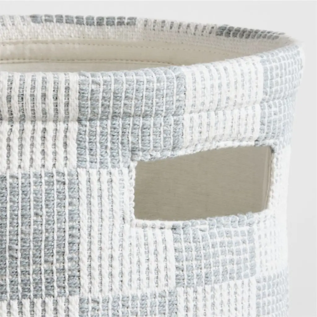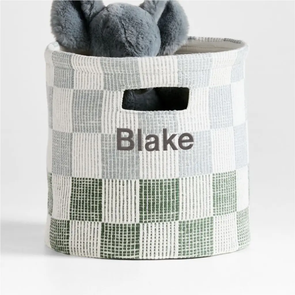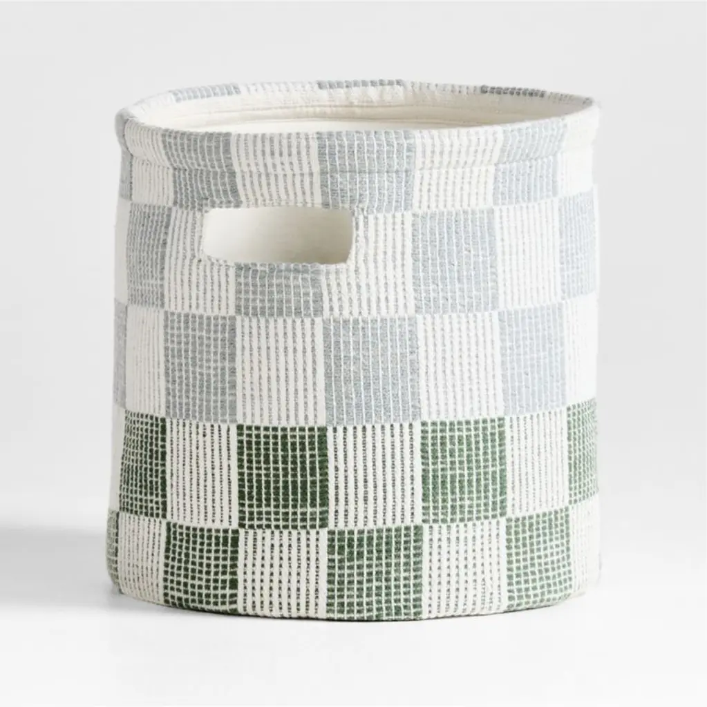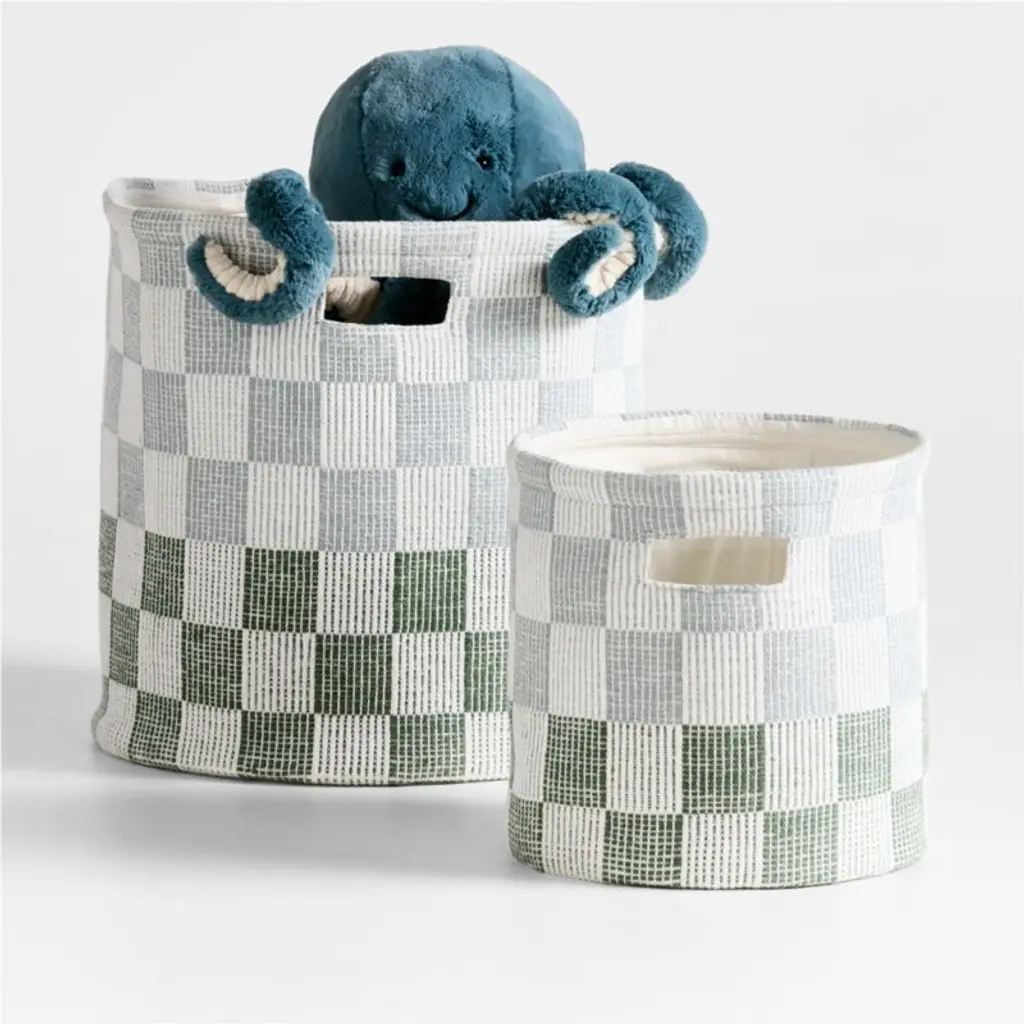 Get on board with cheerful checksour Hopscotch Checkerboard Shelf Storage Bin makes a playful style statement in any room. The woven organic cotton container is durable and roomy enough for toys, books or craft supplies, while the graphic, versatile pattern in mist blue and pine green brightens up nurseries, bedrooms, playrooms and shared family spaces.