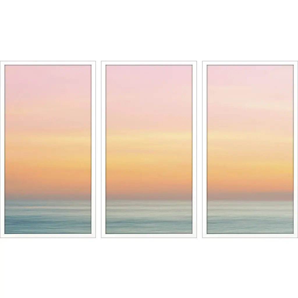 Horizons. A reproduction of work by abstract artist Lee Lessem, this three-piece print set strikes a delicate balance between fluidity and structure, softness and vitality, and mystery and clarity. They’re printed on paper in the USA, and arrive in wooden frames with hanging hardware.