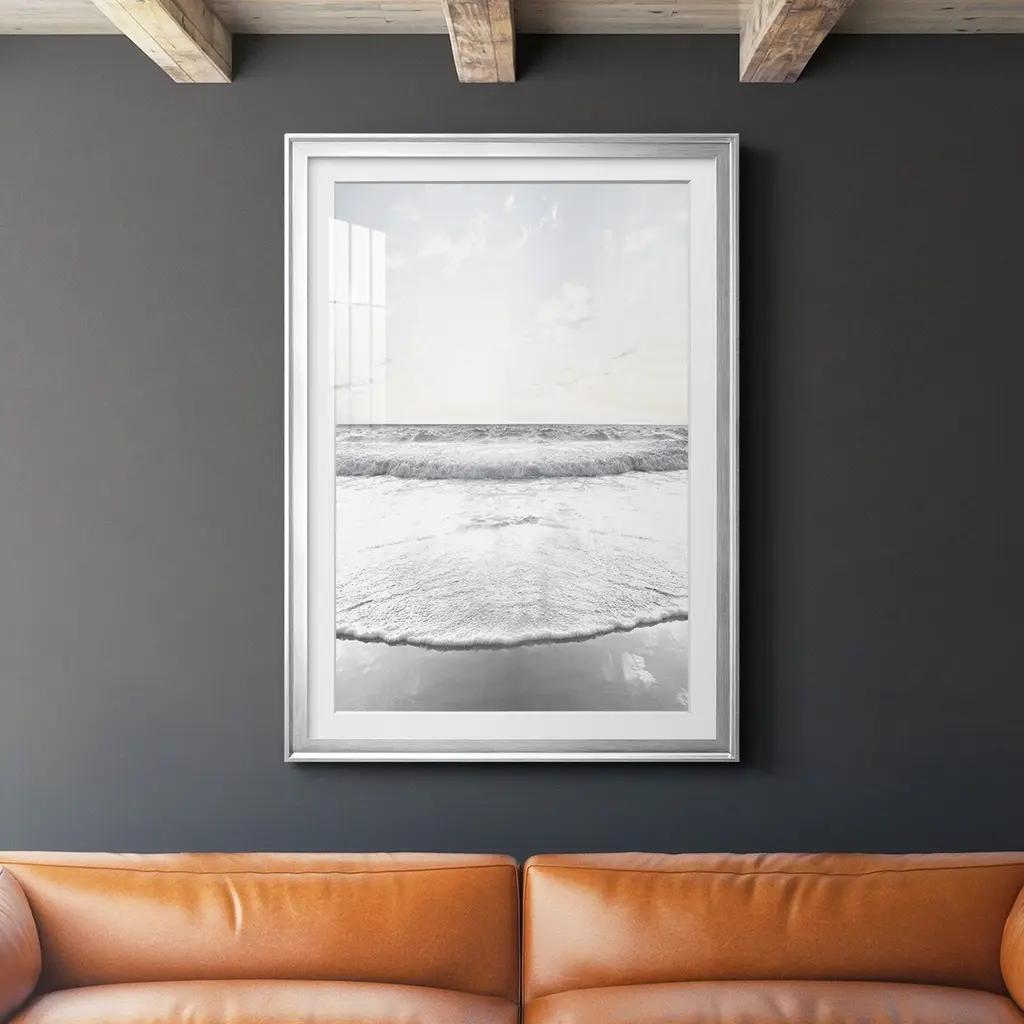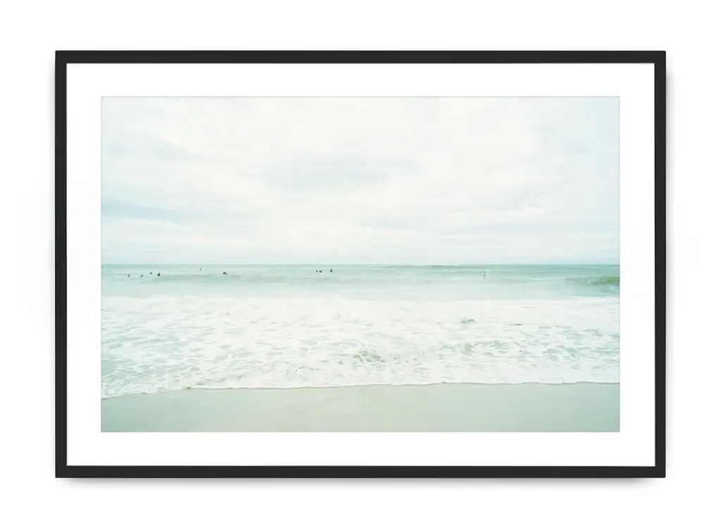 “Horizons No. 4867" (2020) provides a simultaneously vast and near view of the ocean, with the faint line of the horizon in the distance and soft-focus waves approaching the shore. The image is printed on heavyweight cotton-rag archival paper using museum-grade archival inks. Each arrives signed, numbered, and ready to hang, in a white maple corner-splined frame complete with spacers, strainer, and French cleat. The 54" x 72" is an edition of 7, the 40" x 60" is an edition of 12, and the 30" x 40" is an edition of 24.