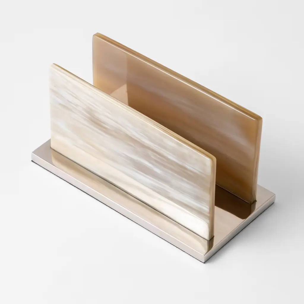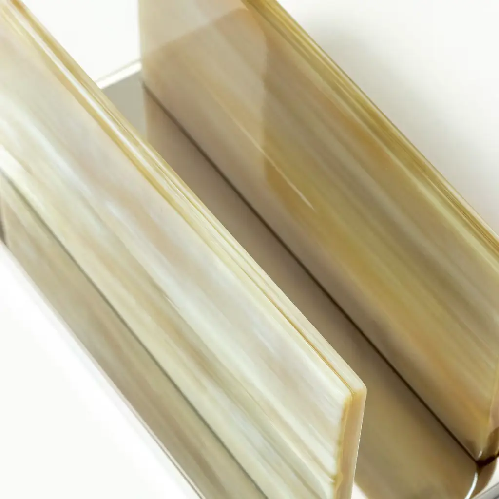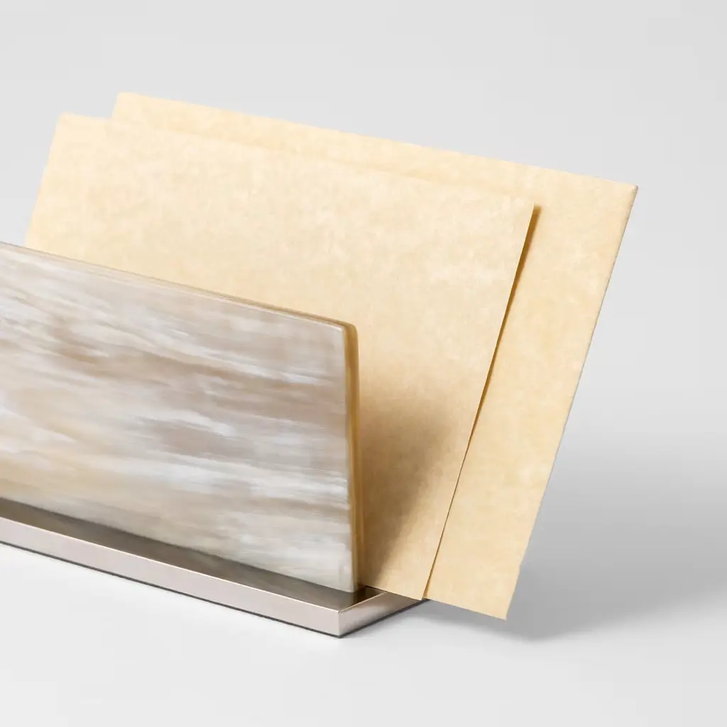 This elegant piece of functional decor is a precious addition to both a classic and a contemporary interior, where it will be a striking and useful letter holder in an entryway or on a desk - either at home or in an office. The brass rectangular base (either with a nickel or gold finish) was worked with the innovative technology of Computer Numeric Control and supports two elements in horn that were crafted by hand and finished with natural wax. This translucent, natural material adds a one-of-a-kind precious touch to this piece. Part of the Leonardo Collection.