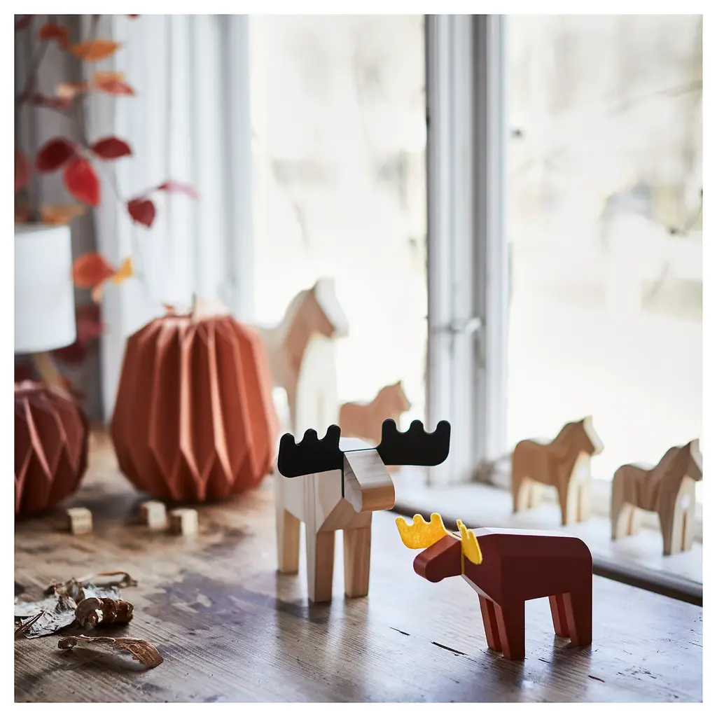 HÖSTAGILLE Decoration, moose - pine/black 7 ". A majestic decoration that gladly keeps you company during dark autumn evenings – and all year round. Made of solid pine with large antlers in soft polyester felt.