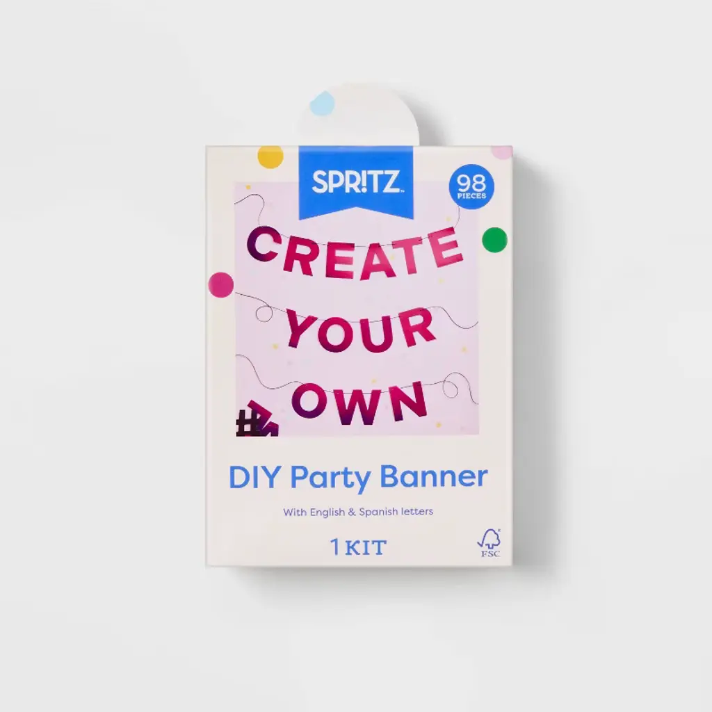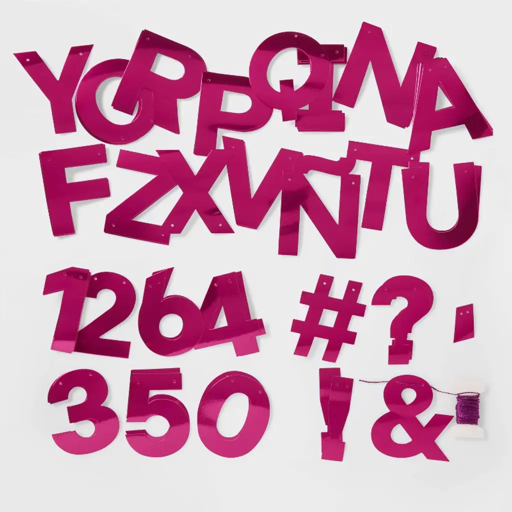This Hot Pink Metallic Create Your Own Banner from Spritz™ makes a great go-to décor for any event. Comes with letters in English and Spanish giving you the creativity to make anything. With a metallic Hot Pink finish, this banner is a simple yet striking decoration. Simply hang it across a doorway, mantel, buffet table or anywhere else in your party space for an instant pop of color.INCLUDES :4 each of A, E, F, I, O3 each of C, D, G, H, L, N, R, S, T2 each of B, J, K, M, P, U, V, W, Y, Z, 0, 1, 2, 3, 4, 5, 6, 7, 8, 9 1 each of Q, X, Ñ, !, ?, ' , #, &, ¡, ¿