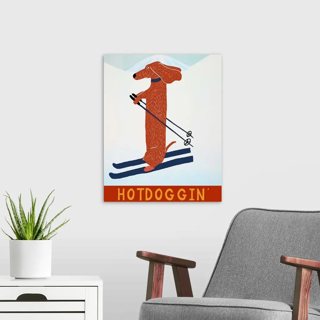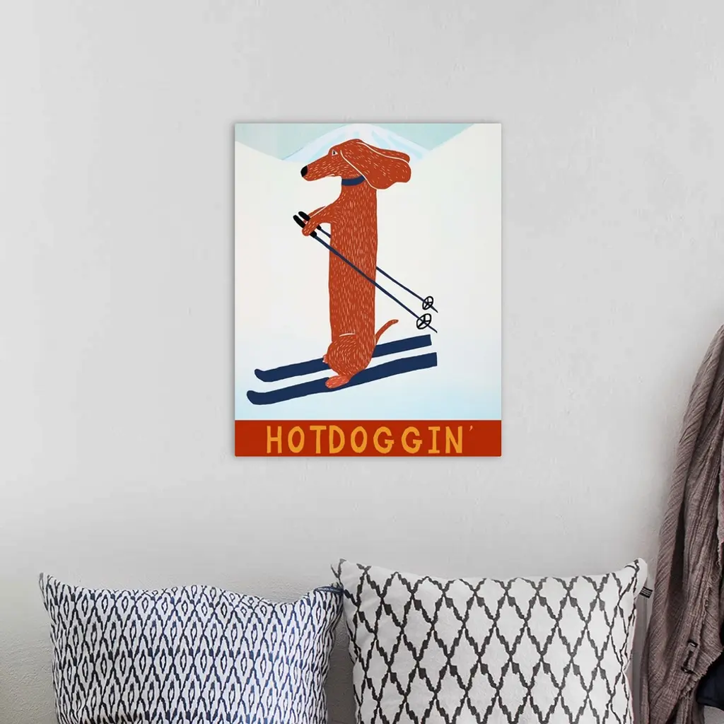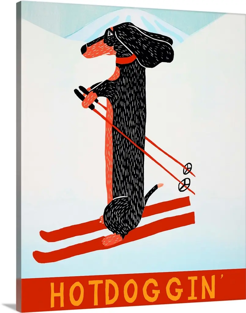 Illustration of a dachshund skiing down the slopes with the phrase "Hotdoggin'" written at the bottom.