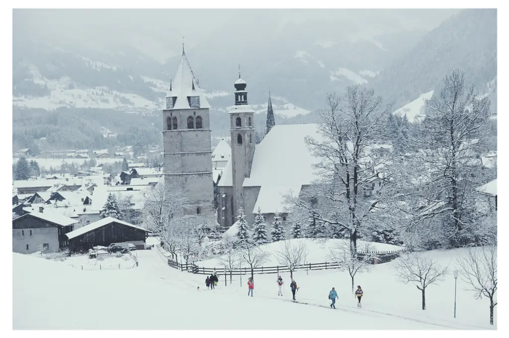 View of hotels and lodges with mountains in background during winter, Courmayeur, Aosta Valley, Italy