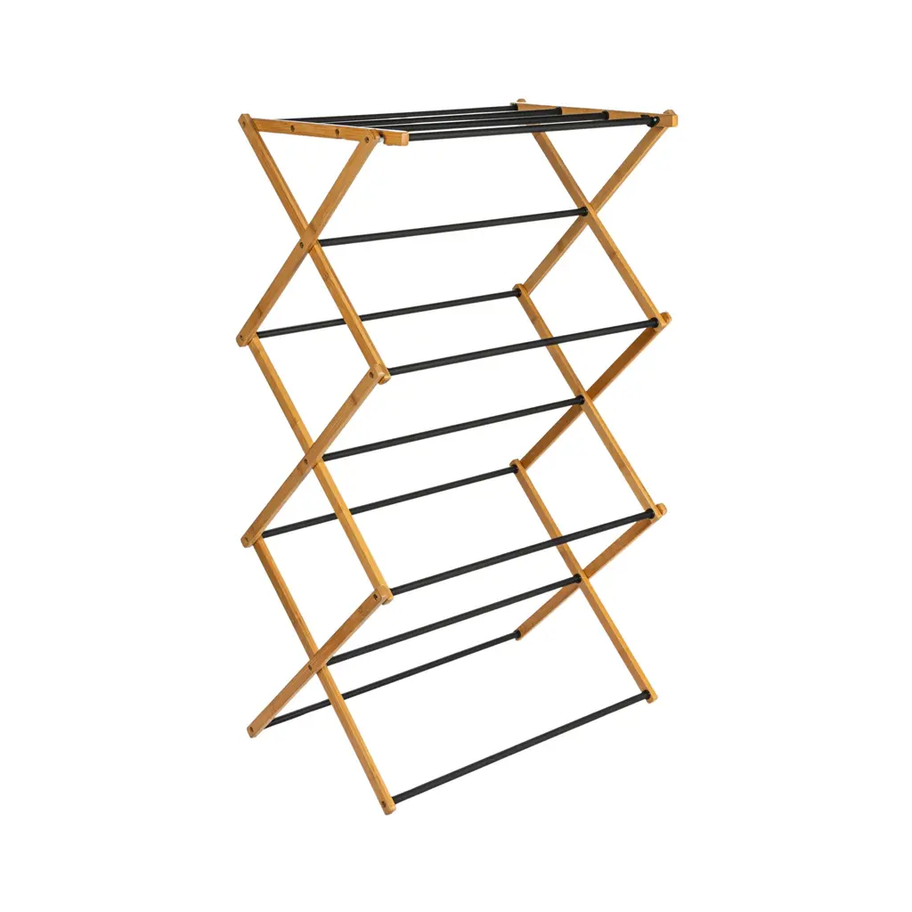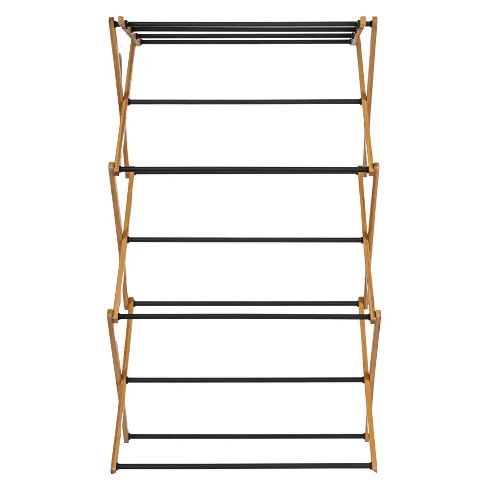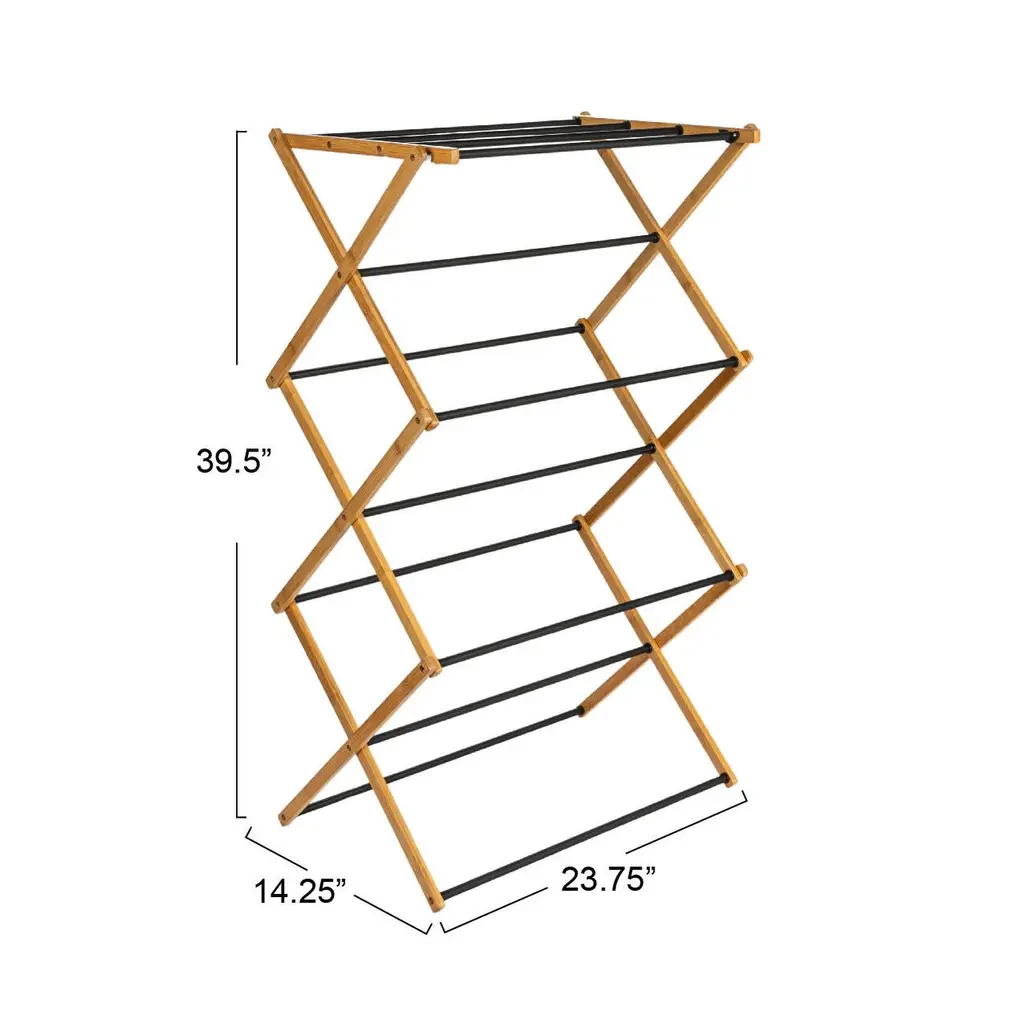 This Bamboo Folding Drying Rack boasts excellent materials and promises to save you on your next electric bill throughout the warmer seasons. This clothes drying rack is made of natural bamboo and black coated dowels, giving it an upscale look and feel. Bamboo is a sustainable and renewable resource, a sturdy alternative to everyday wood. The lightweight X-frame holds together 11 usable dowels and offers around 21 feet of drying space and a weight capacity of 25 lbs, making it a compact solution for small spaces. The frame and doweled feet work together to provide great stability for the rack. The dowels are spaced out evenly to accommodate varying sizes of clothing and encourage air circulation. To lay sweaters flat to dry, use the convenient top set of dowels, which are arranged more closely together. For added convenience, this product comes fully assembled and can be quickly folded for compact storage. This is a great option for dormitories without driers or smaller houses and apartments.Features: