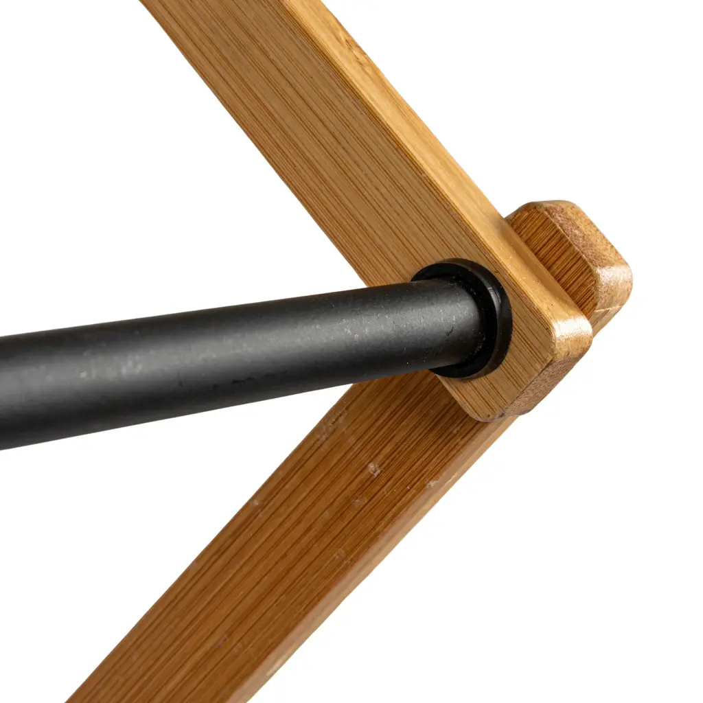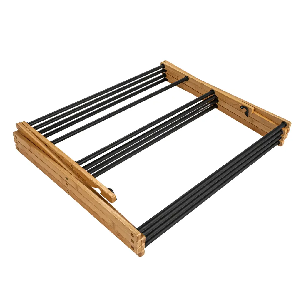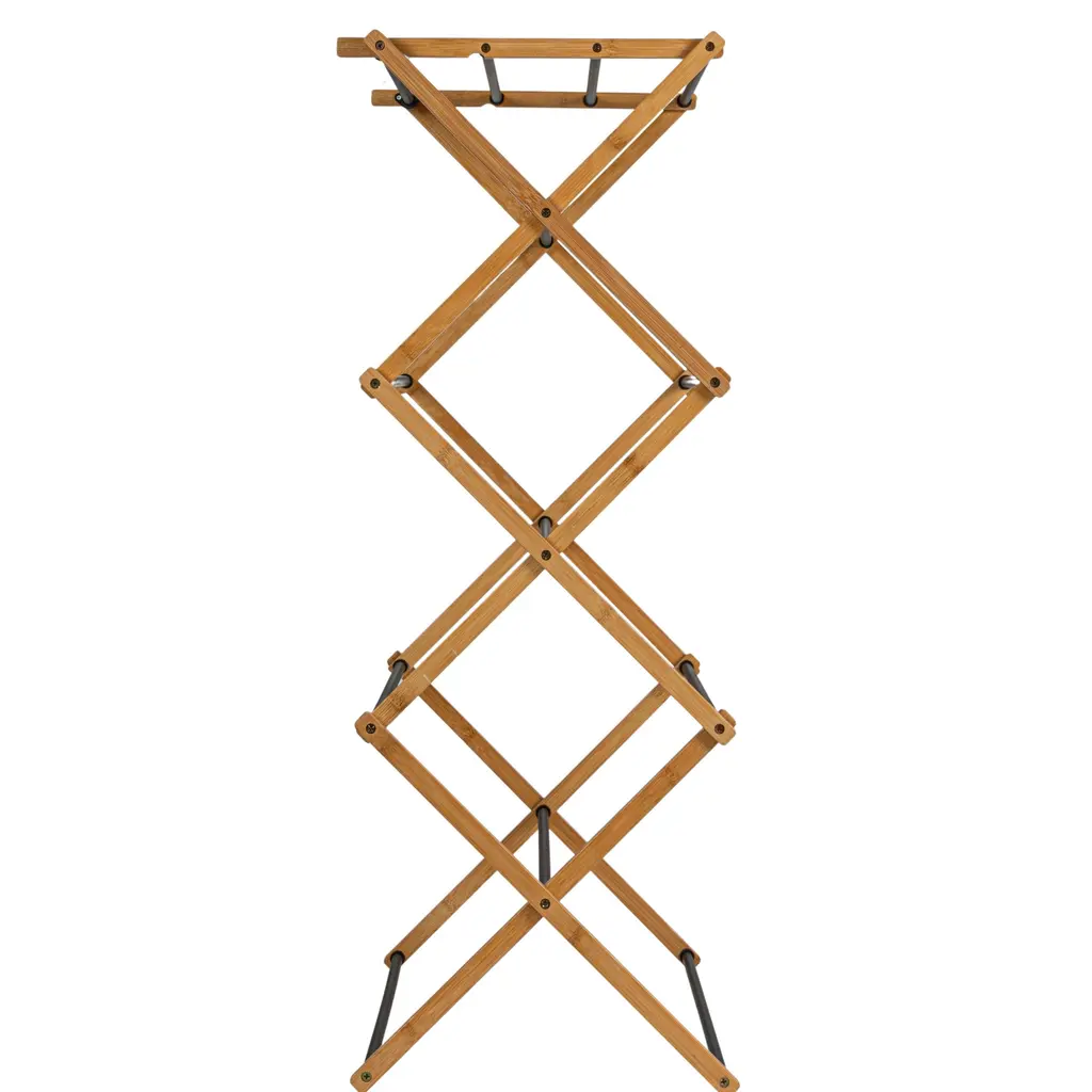 This Bamboo Folding Drying Rack boasts excellent materials and promises to save you on your next electric bill throughout the warmer seasons. This clothes drying rack is made of natural bamboo and black coated dowels, giving it an upscale look and feel. Bamboo is a sustainable and renewable resource, a sturdy alternative to everyday wood. The lightweight X-frame holds together 11 usable dowels and offers around 21 feet of drying space and a weight capacity of 25 lbs, making it a compact solution for small spaces. The frame and doweled feet work together to provide great stability for the rack. The dowels are spaced out evenly to accommodate varying sizes of clothing and encourage air circulation. To lay sweaters flat to dry, use the convenient top set of dowels, which are arranged more closely together. For added convenience, this product comes fully assembled and can be quickly folded for compact storage. This is a great option for dormitories without driers or smaller houses and apartments.Features:
