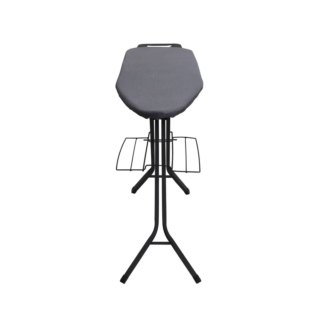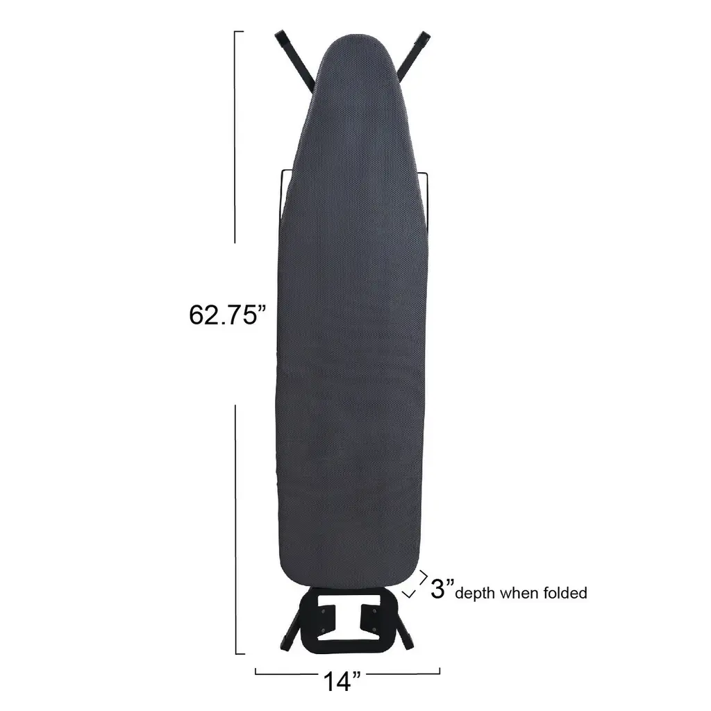 With stunningly chic style and a smart design, this deluxe ironing board stands out from the crowd. Using this ironing board promises crisp results on button-ups, slacks, bedsheets, tablecloths, curtains and more. Unlike SOME other ironing boards, this boasts a durable mesh steel top. This durable mesh offers more stability and allows steam and heat to circulate through fabric for better, faster and more even results than you’d get with other steel-top boards. This steel mesh top is a must-have feature for anyone who irons frequently, especially with steam or higher temperatures. This ironing board utilizes additional improved features, including durable hex legs with skid-resistant caps and a sleek, elegant matte black finish. The 4 hex legs cover a greater surface area to provide the best form of stability. The gray FiberTech cover attaches to the ironing board with a simple drawstring cord. Underneath the cover is a durable, 6mm-thick fiber pad. This thick layer prevents imprints from the steel ironing surface transferring onto your garments and creates a smoother finish. The cover and pad has been stress tested to ensure durability and resistance to high temperatures. This ironing board creates enviable results and is highly convenient. Attached to the end of the board is an iron rest outfitted with heat-resistant silicone pads. This serves as a safe and reliable spot to rest your iron as it warms up and cools down. This iron rest has multiple slots to hang articles of clothing within reach. The board has 4 height settings that can be adjusted with a quick push of a lever. This deluxe ironing board can be folded down for compact storage. It can easily hang behind a door, on the wall or inside a closet. The modern matte finish and functionality of this ironing board make it the prime choice for anyone looking to complete their daily ironing in style.Features:
