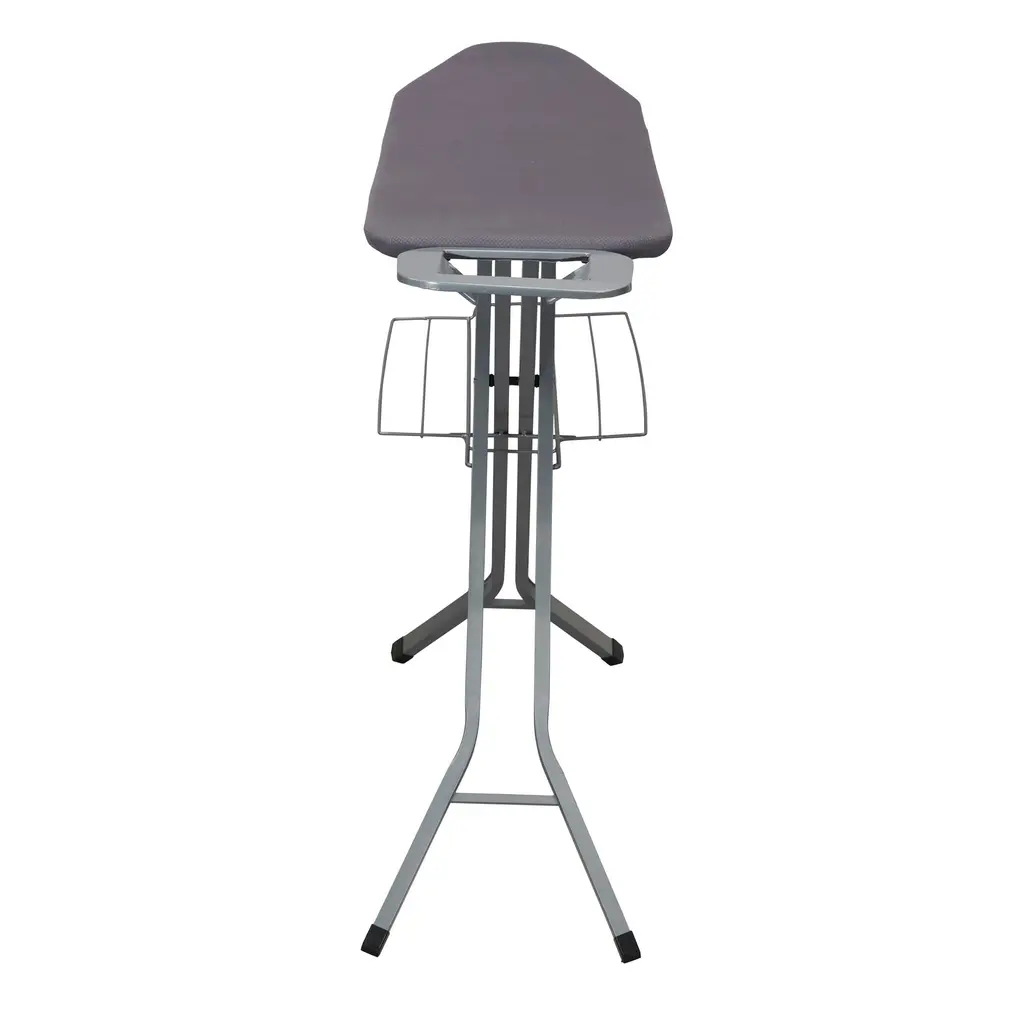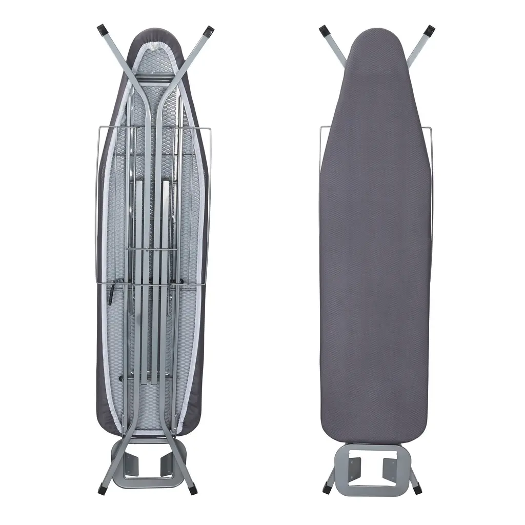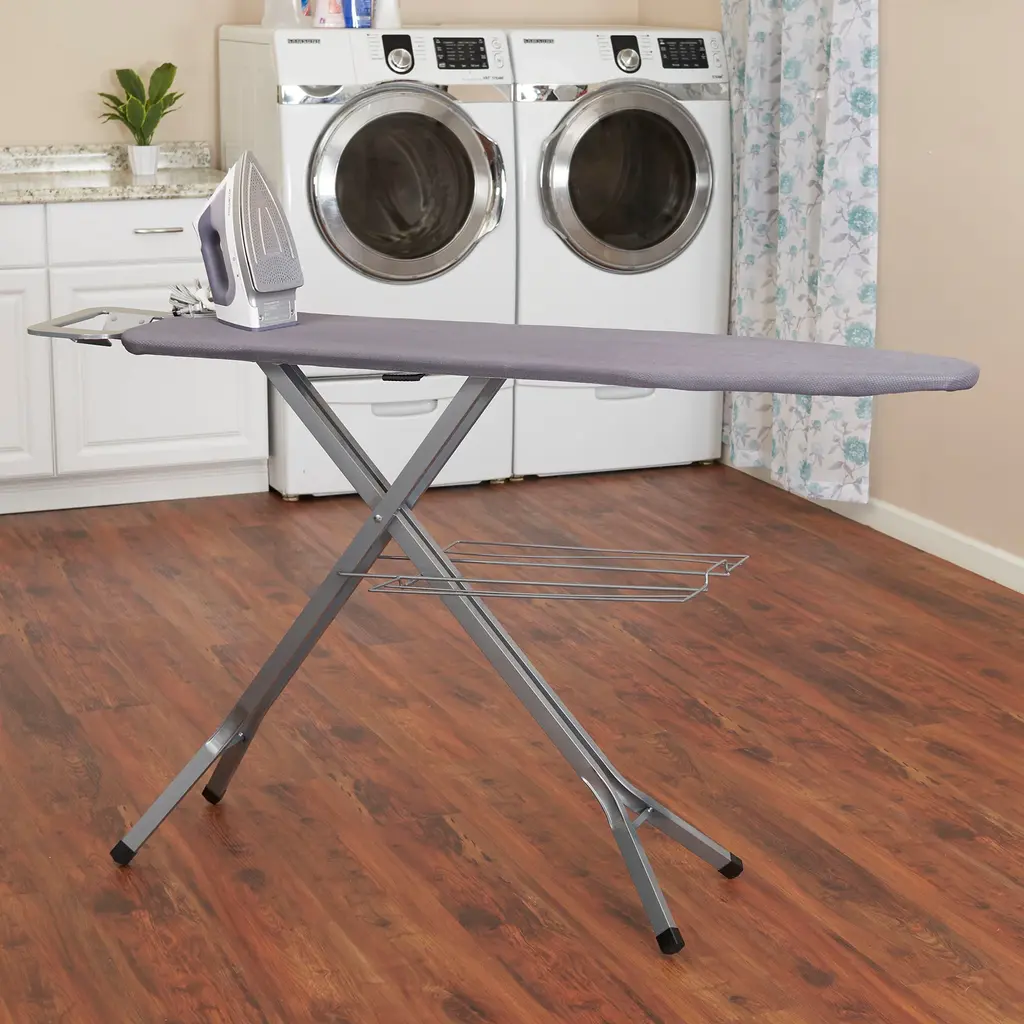 With stunningly chic style and a smart design, this deluxe ironing board stands out from the crowd. Using this ironing board promises crisp results on button-ups, slacks, bedsheets, tablecloths, curtains and more. Unlike SOME other ironing boards, this boasts a durable mesh steel top. This durable mesh offers more stability and allows steam and heat to circulate through fabric for better, faster and more even results than you’d get with other steel-top boards. This steel mesh top is a must-have feature for anyone who irons frequently, especially with steam or higher temperatures. This ironing board utilizes additional improved features, including durable hex legs with skid-resistant caps and a sleek, elegant matte black finish. The 4 hex legs cover a greater surface area to provide the best form of stability. The gray FiberTech cover attaches to the ironing board with a simple drawstring cord. Underneath the cover is a durable, 6mm-thick fiber pad. This thick layer prevents imprints from the steel ironing surface transferring onto your garments and creates a smoother finish. The cover and pad has been stress tested to ensure durability and resistance to high temperatures. This ironing board creates enviable results and is highly convenient. Attached to the end of the board is an iron rest outfitted with heat-resistant silicone pads. This serves as a safe and reliable spot to rest your iron as it warms up and cools down. This iron rest has multiple slots to hang articles of clothing within reach. The board has 4 height settings that can be adjusted with a quick push of a lever. This deluxe ironing board can be folded down for compact storage. It can easily hang behind a door, on the wall or inside a closet. The modern matte finish and functionality of this ironing board make it the prime choice for anyone looking to complete their daily ironing in style.Features:
