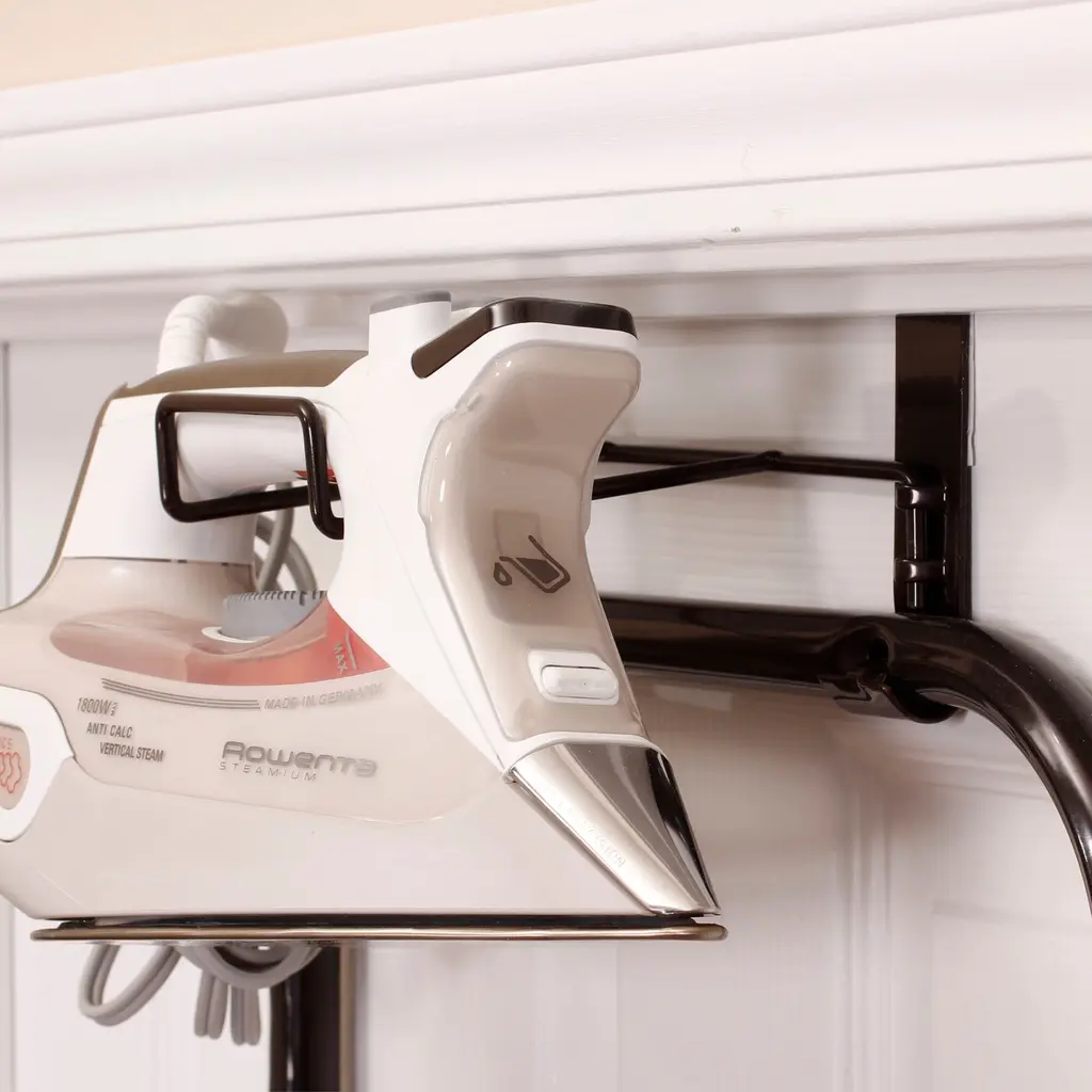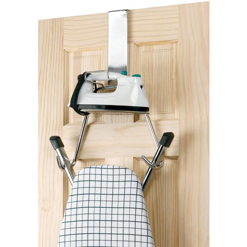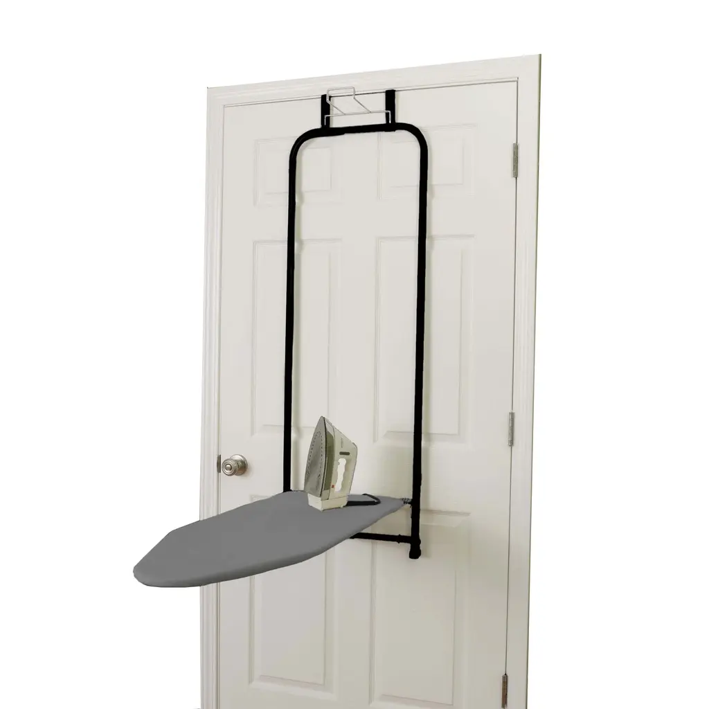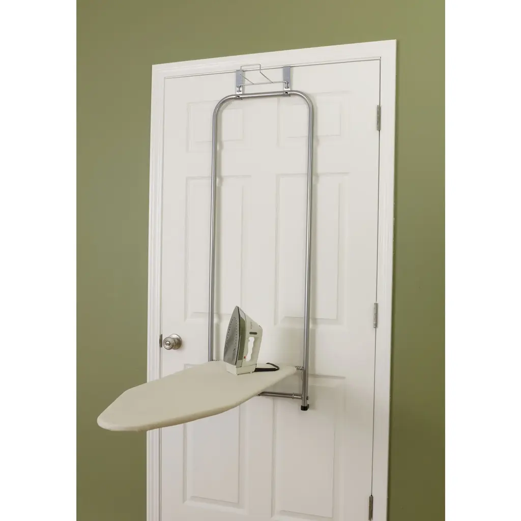 This space saving 144336 HOUSEHOLD ESSENTIALS Bronze Over-the-Door Ironing Board makes ironing simple and convenient. The board hooks over the top of residential or commercial doors, keeping the ironing board handy and out of the way. Simply pull down the board to use it, and press the lever once and watch the board close itself. The Over-The-Door style ironing board fits perfectly in busy households, in walk-in closets and baths, and on the back of bedroom doors. The bronzed steel frame is elegant, making this compact ironing board a great choice for a board that might be seen. The bronze cover has a slight shimmer and is stain and scorch resistant. The 14 x 41 inch steel top ironing surface is perfect for use with steam irons. The fiber pad and 100% cotton cover ensure a smooth and durable ironing surface. The board sticks out approx.. 43.3 inches from the door when open and approx. 2 inches from the door when closed. Rubberized end caps help protect your door and stabilize the board during ironing. A metal iron holder on top of the frame even keeps the iron handy.Features: