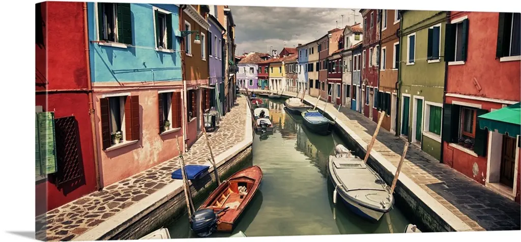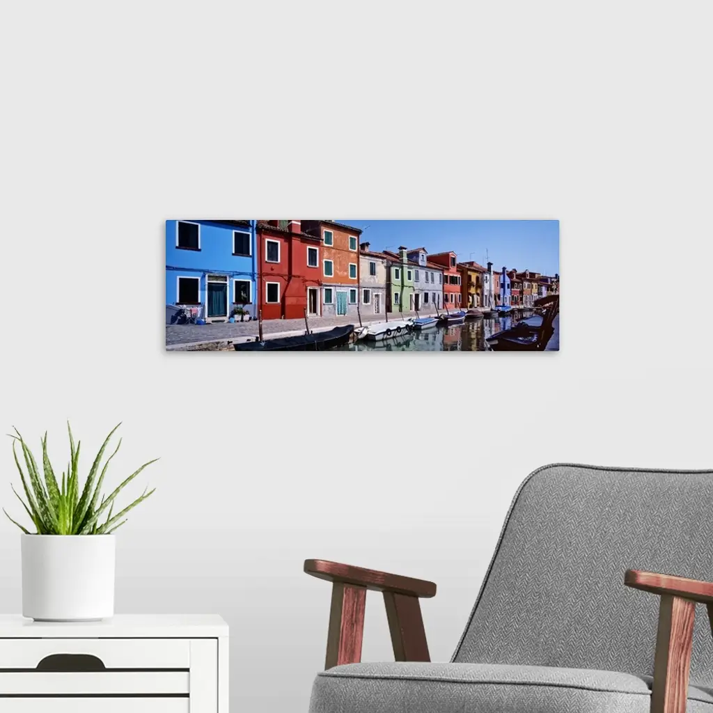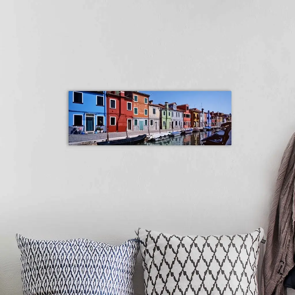 Panoramic photograph of colorful houses lined up next to each other on a lagoon with boats tied up in the water.