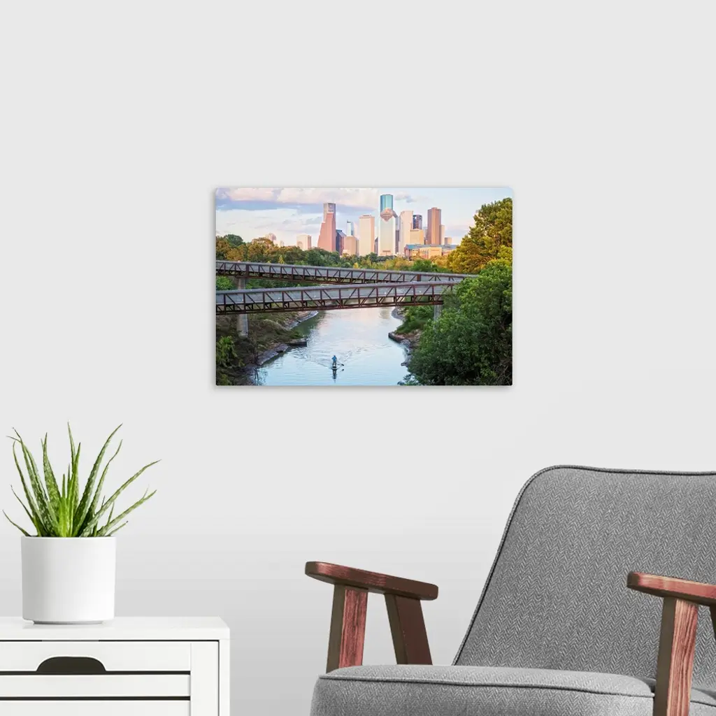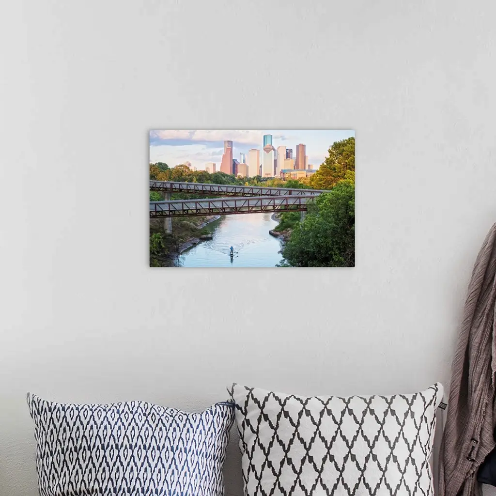 Photograph of the Houston TX skyline in the distance with the Rosemont pedestrian bridge in the foreground over the Buffalo Bayou with a man paddle boarding in a cowboy hat.