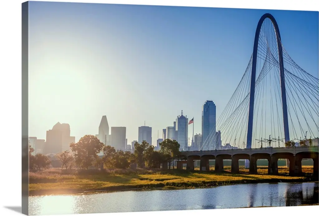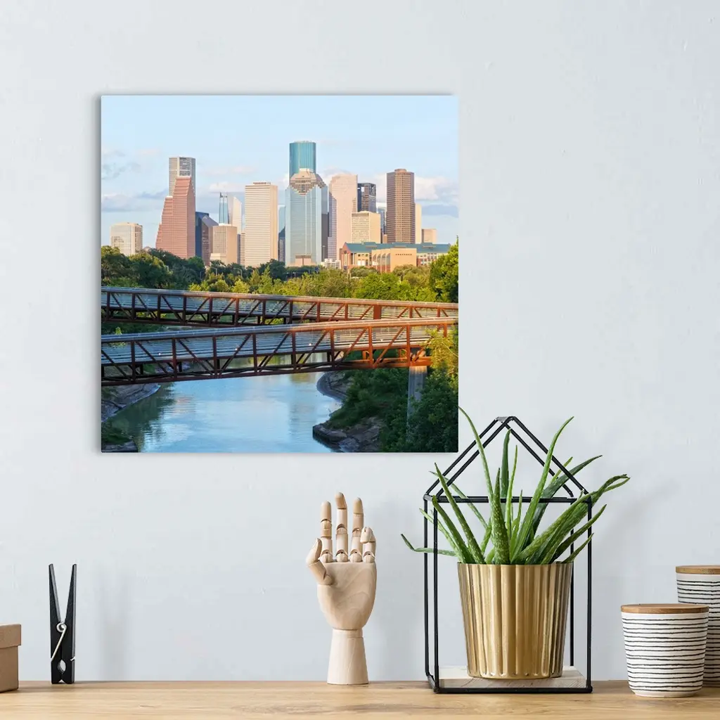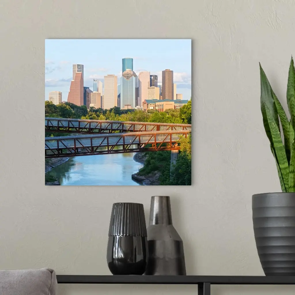 Square photograph of the Houston TX skyline in the distance with the Rosemont pedestrian bridge in the foreground over the Buffalo Bayou.
