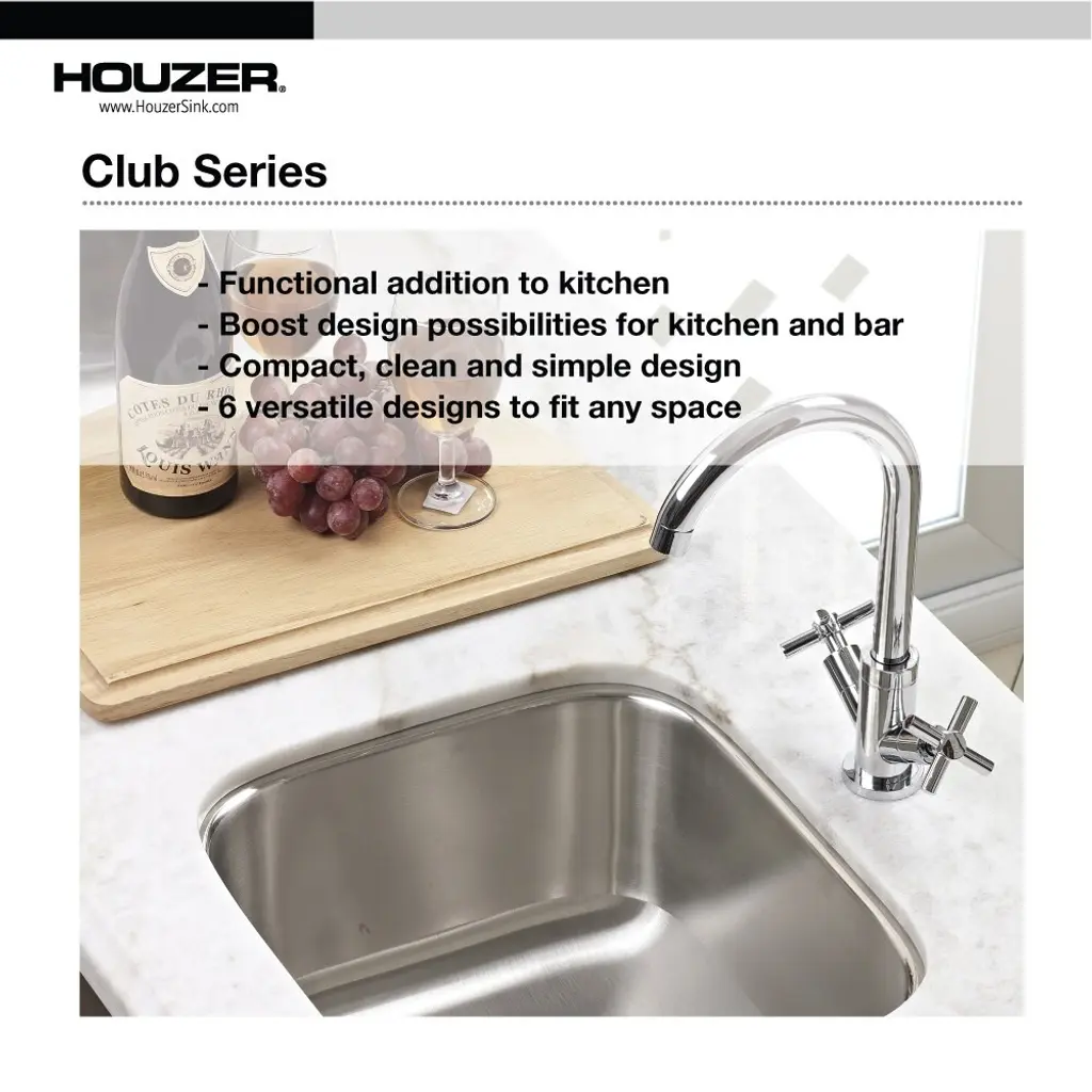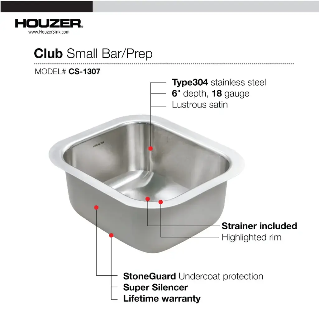Houzer Club series small undermount bar/prep sink is a sleek and versatile addition to any kitchen or bar area. Whether used as a stand-alone sink or paired with another, its compact size and clean lines bring both style and functionality to your space. Crafted with a lustrous finish and highlighted rim, this sink adds a touch of elegance to your kitchen or bar. The exclusive SpecPlus edges ensure durability, while the StoneGuard undercoating over a super silencer pad minimizes the clattering sound of glasses and silverware, creating a quieter environment. Additionally, it prevents condensation buildup under the bowl. Meets ASME 100.19.3-2000, UPC standards. This sink offers both quality and peace of mind for your kitchen or bar needs.Houzer CS-1307-C Features:Houzer CS-1307-C Specifications: