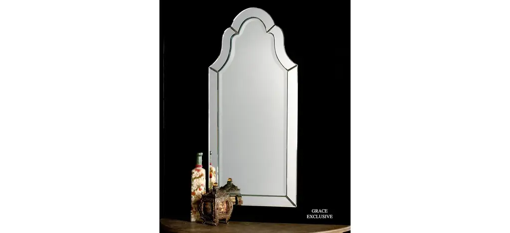 This frameless, arched mirror has polished edges for a smooth, clean finish. The etching and v-grooves give wonderful character to this beveled mirror.