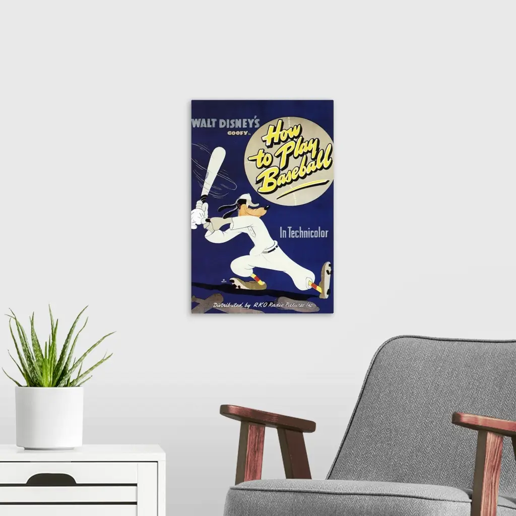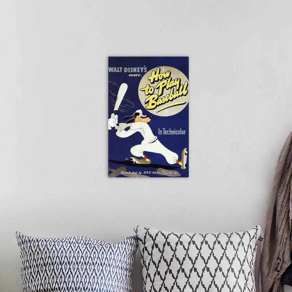 Vintage movie poster for Disney's Goofy film "How to Play Baseball" with Goofy in an old time baseball uniform up to bad and ready to hit a ball.