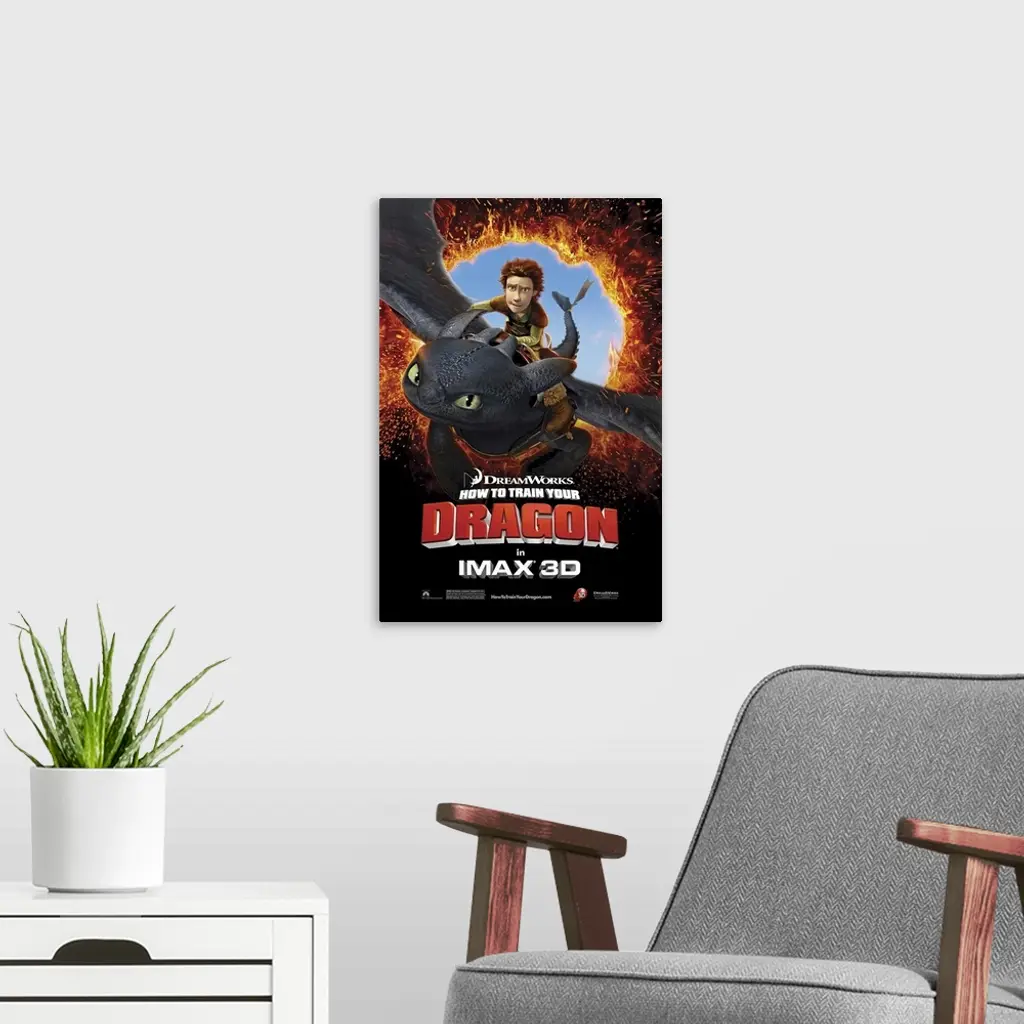 A movie poster for the popular animated movie shows the hero rides on the back of a dragon through a circle of fire.