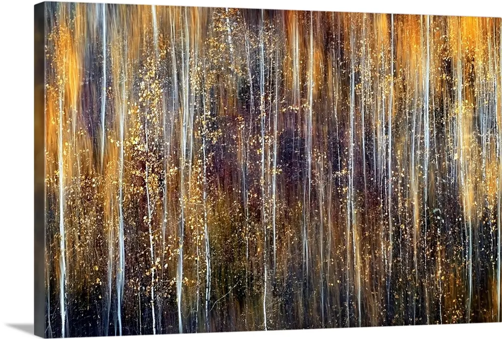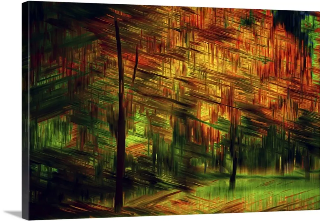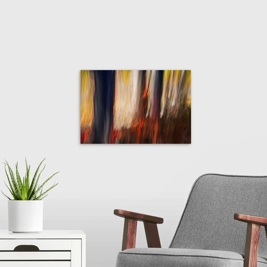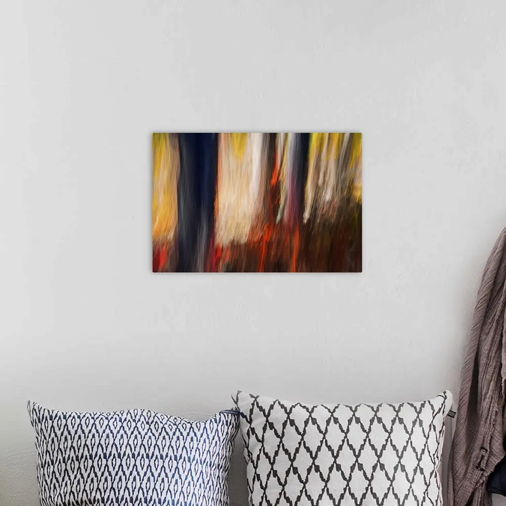 Abstract image of a bunch of huckleberry bushes in glorious Autumn red, in between a bunch of tree trunks blackened and stripped in a wildfire. The image was made in the mountains close to Rossland, British Columbia, Canada in early October, 2022. It was made using the ICM (Intentional Camera Movement) technique. This technique creates the colorful stripes in the image, and serves to give a good impression of the place. Ursula Abresch Abstract Trees Collection