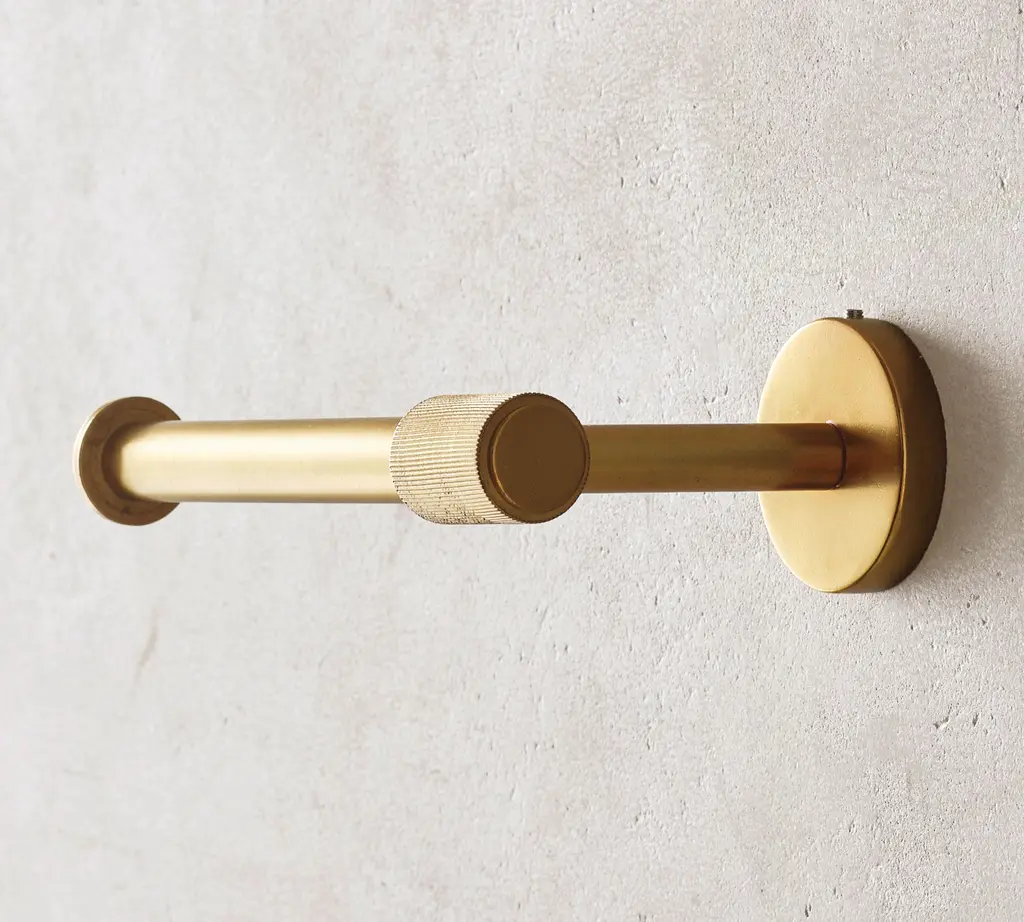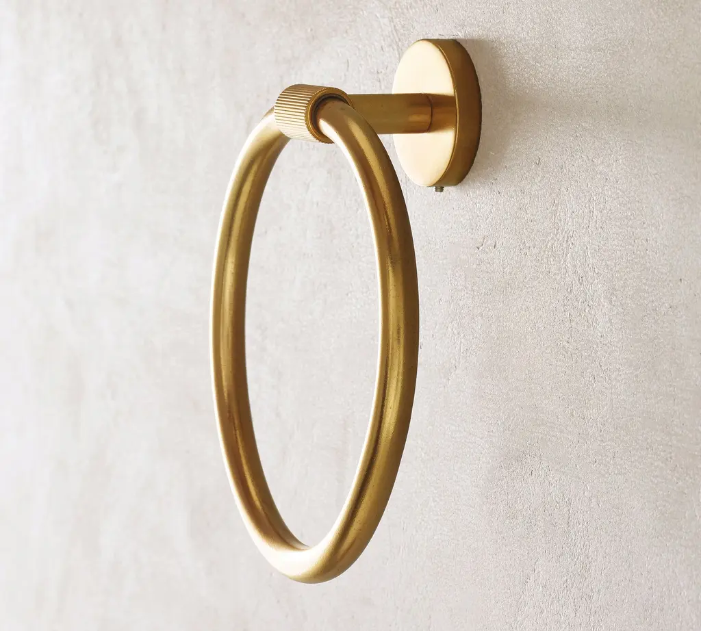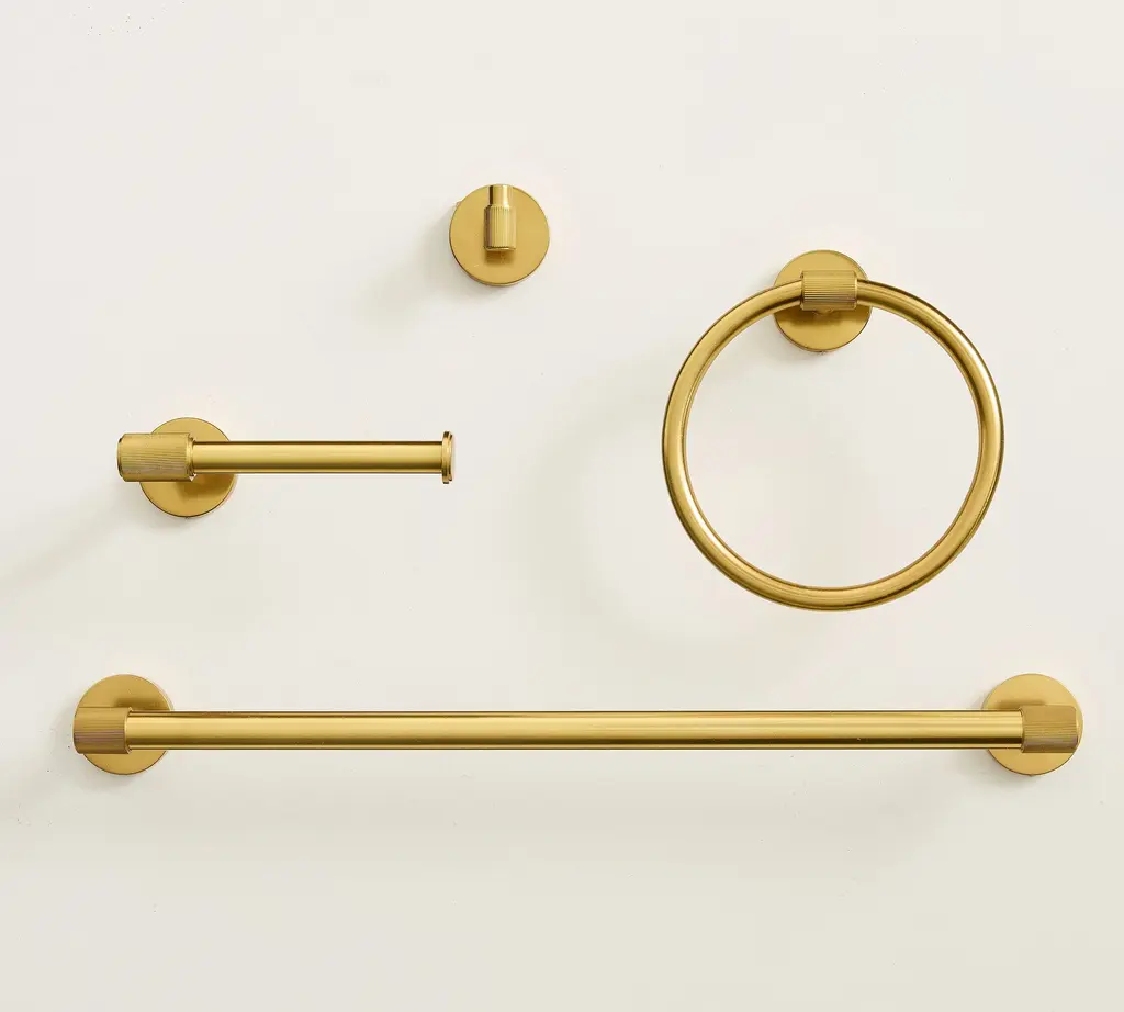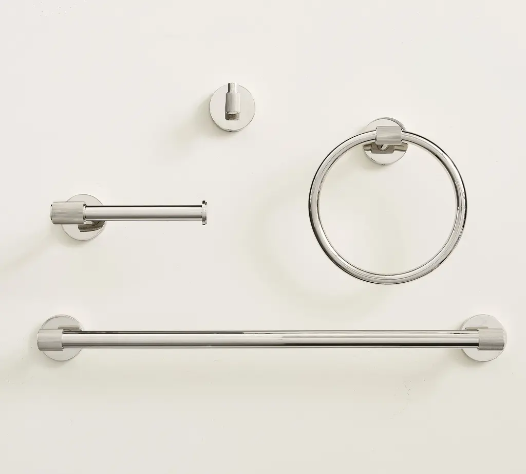 Hudson hardware recalls the cool, modern chic of the 1970s. Crafted in brass with cuffed and knurled details in a choice of finishes, this collection offers a bold look (and an easy way to refresh the bath or powder room) without overpowering.