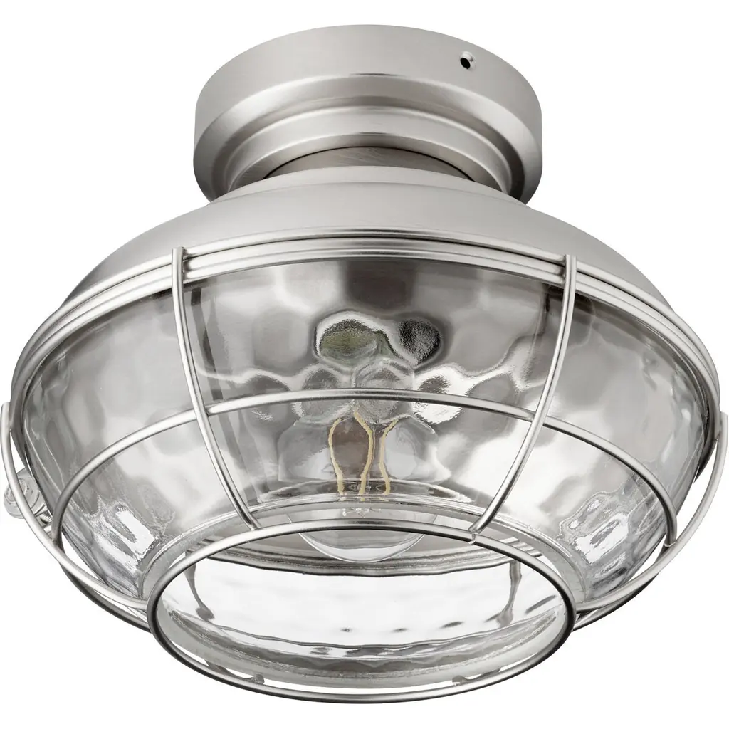 Create a festive environment filled with clean, textured light as the Hudson Patio Fan Light Kit from Quorum International looms over your outdoor arrangements. Layers of round metal forms flow onto each other from the canopy, creating a fresh modern silhouette. Hand-hammered glass rounds out the base of the bowl structure, protected by a caged framework. A generous light radiates from the clear enclosure, leaving behind a dazzling pattern of sophisticated hand-hammered shapes.