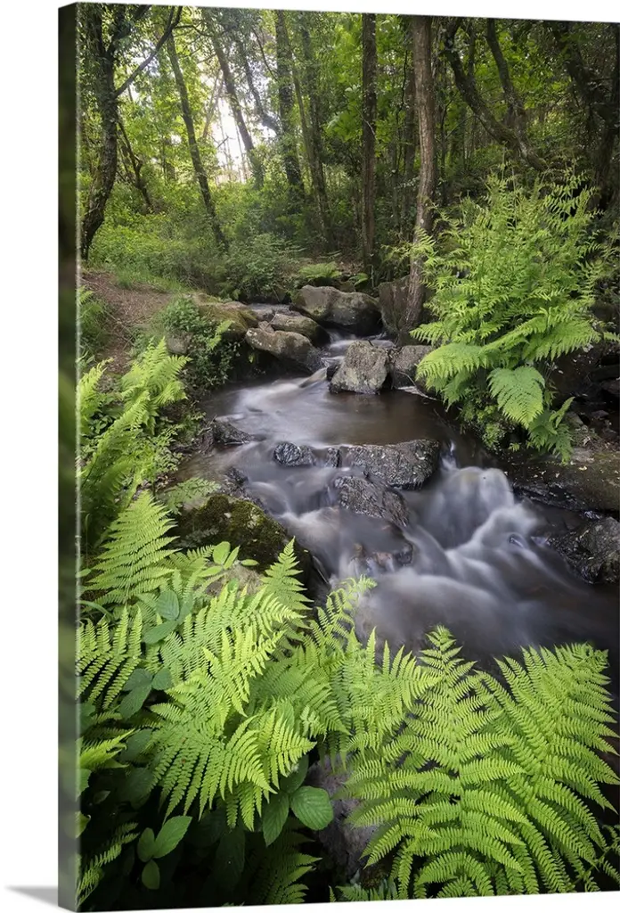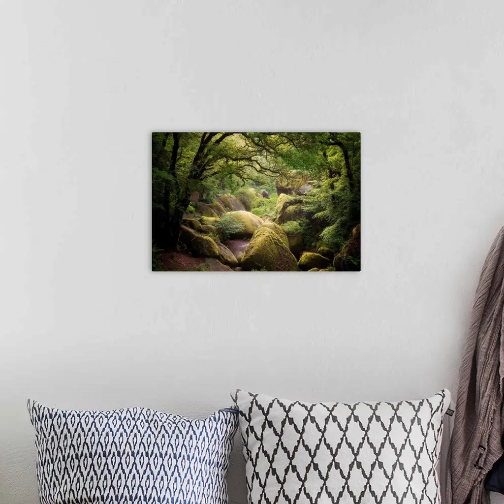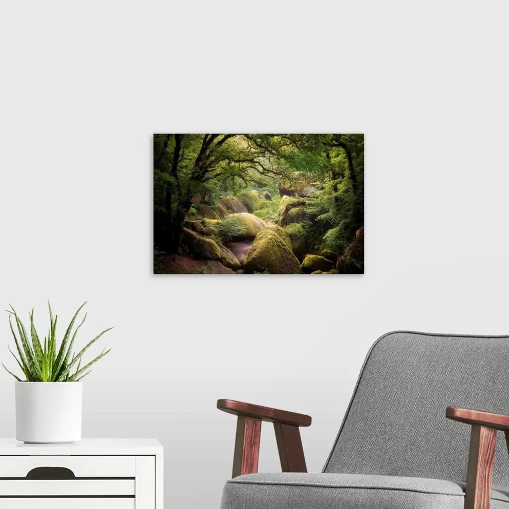 Picture of huelgoat forest in Brittany with big granitic rocks and green trees in the place called the chaos