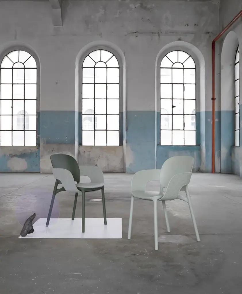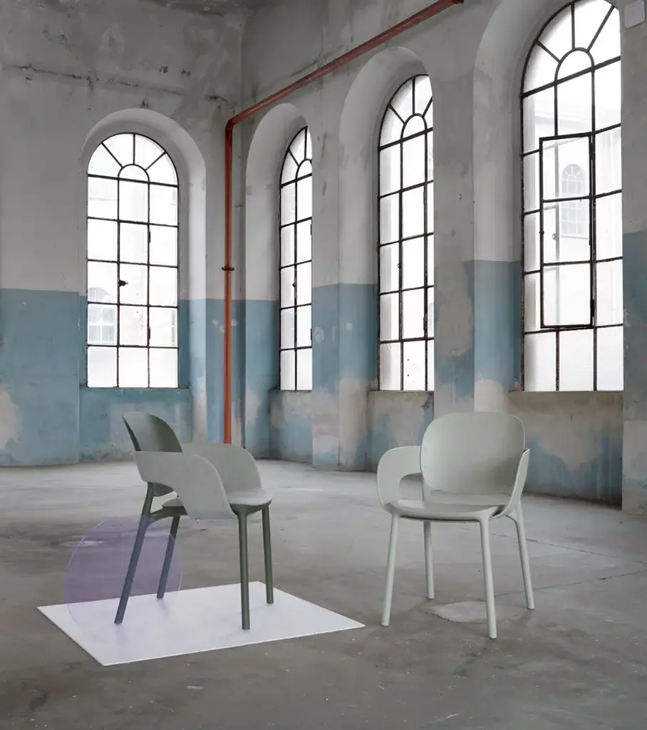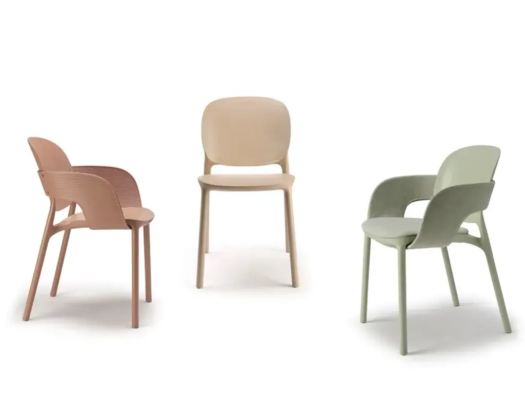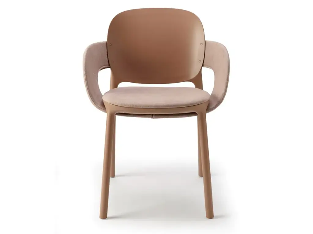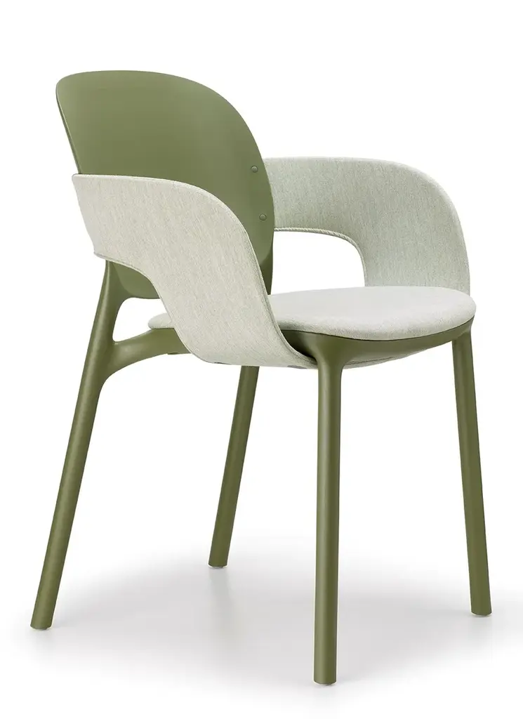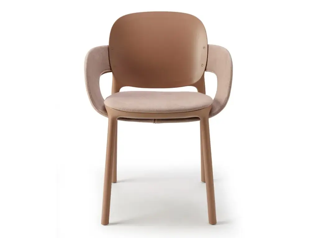Hug is a fabric chair with integrated cushion.An extremely distinctive element has been designed for HUG chair and armchair: between seat andback, which have rounded and balanced shapes for best usability, the designers have introduced aband element, enveloping like an embrace. A luxury to be enjoyed both outdoors and indoors, following the well-established trend of treating both environments with the same aesthetic codes. Two variants are available: you can opt for a version entirely in techno polymer that is particularly graphic and beautiful to look at from every perspective, defined by an all-over embossed striped motif along the band; or a more graceful one, with the addition of a seat cushion and padded band covered in fabric, to increase the effect of enveloping comfort.The designers declare “The HUG collection represents the consolidation of the collaboration between Meneghello Paolelli and S•CAB. It is a complex and ambitious project, a project that started from theorigins of the company, a monocoque chair, and which comes to deal with real issues of usability and sustainability which represent today's society.”HUG is technically a technopolymer monocoque, but it is actually a flexible system in which the components combine to create different chair and armchair configurations. Designed for theoutdoors, it also fits well in interior spaces, with the possibility of covering some of its parts withfabric. The concept of this chair comes from the balance between the two key elements: seat and back.Two equivalent soft shapes, dimensionally related to each other, in perfect balance. The structureis built around them, an organic continuity uniting these two parts.The introduction of the band creates a bridge between seat and back, a discreet connection thatsubstantially transforms the chair, thus creating a new product. The chair is enveloped in a real andproper hug, which changes its aesthetics and functionality: an original shell defines the armchair.