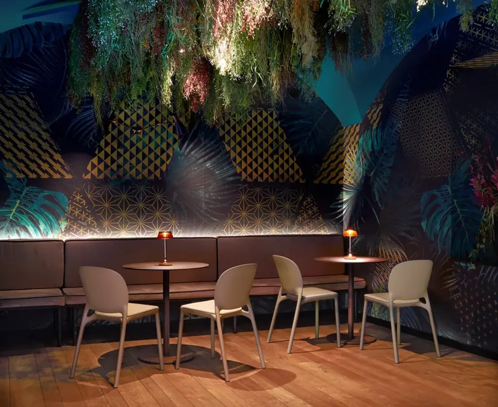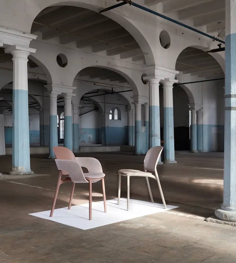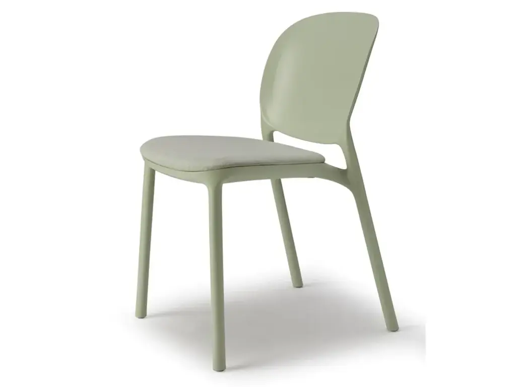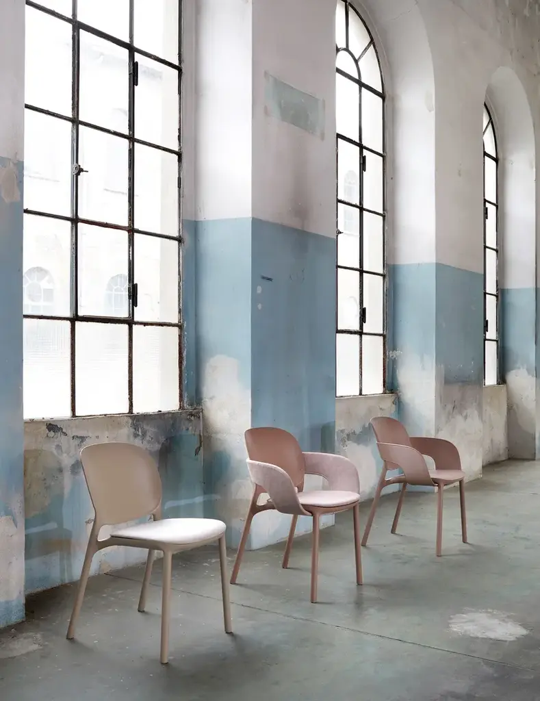 Hug is a polypropylene chair with integrated cushion.An extremely distinctive element has been designed for HUG chair and armchair: between seat andback, which have rounded and balanced shapes for best usability, the designers have introduced aband element, enveloping like an embrace. A luxury to be enjoyed both outdoors and indoors, following the well-established trend of treating both environments with the same aesthetic codes. Two variants are available: you can opt for a version entirely in techno polymer that is particularly graphic and beautiful to look at from every perspective, defined by an all-over embossed striped motif along the band; or a more graceful one, with the addition of a seat cushion and padded band covered in fabric, to increase the effect of enveloping comfort.The designers declare “The HUG collection represents the consolidation of the collaboration between Meneghello Paolelli and S•CAB. It is a complex and ambitious project, a project that started from theorigins of the company, a monocoque chair, and which comes to deal with real issues of usability and sustainability which represent today's society.”HUG is technically a technopolymer monocoque, but it is actually a flexible system in which the components combine to create different chair and armchair configurations. Designed for theoutdoors, it also fits well in interior spaces, with the possibility of covering some of its parts withfabric. The concept of this chair comes from the balance between the two key elements: seat and back.Two equivalent soft shapes, dimensionally related to each other, in perfect balance. The structureis built around them, an organic continuity uniting these two parts.The introduction of the band creates a bridge between seat and back, a discreet connection thatsubstantially transforms the chair, thus creating a new product. The chair is enveloped in a real andproper hug, which changes its aesthetics and functionality: an original shell defines the armchair.
