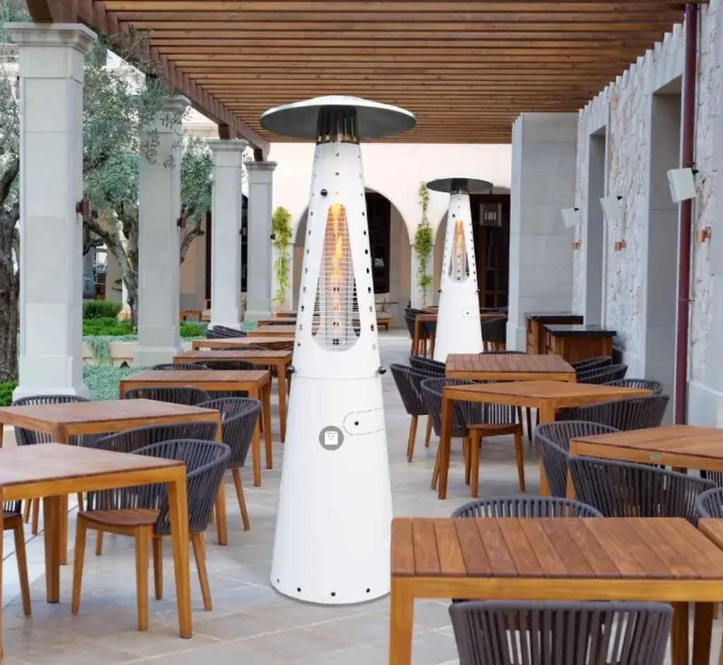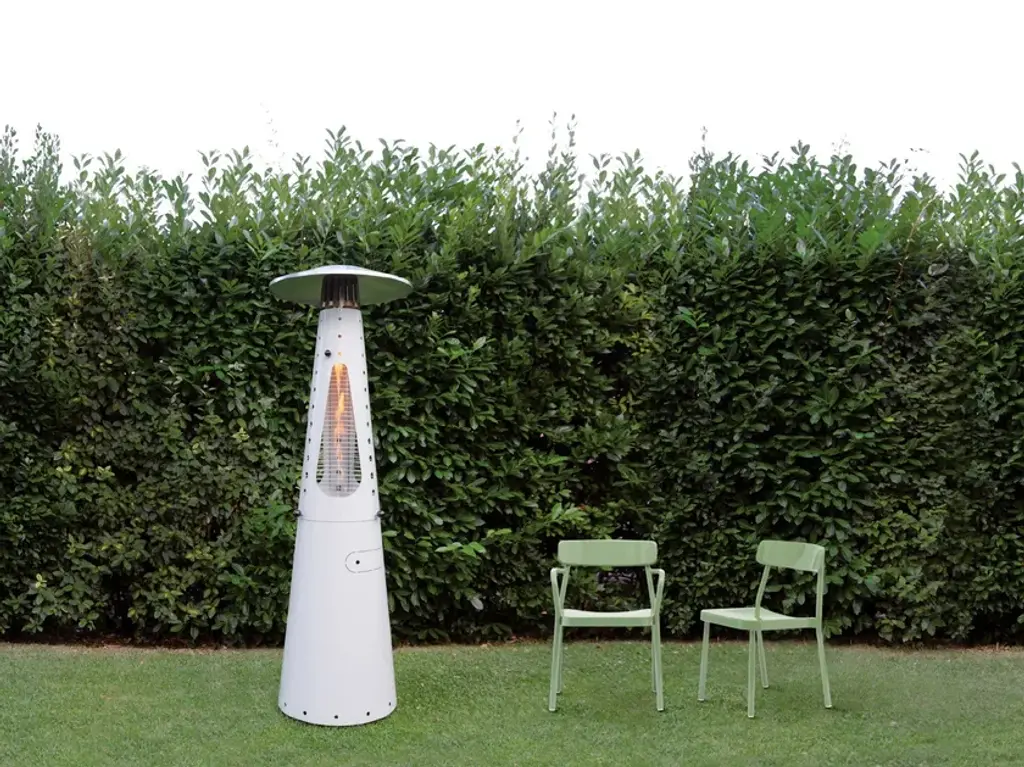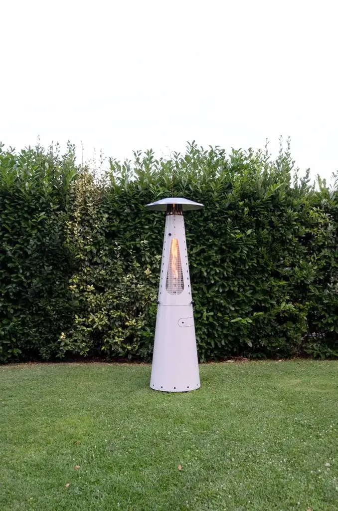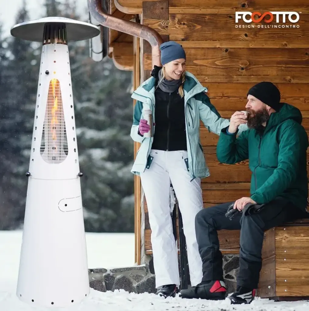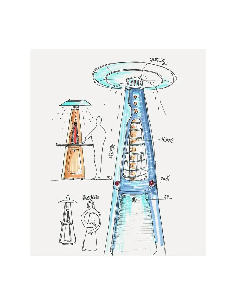Hugfire Lite is a movable outdoor heating stove, in painted steel, modern and design for dehors. Suitable for outdoor environments, contract use and particularly suitable for the HO.RE.CA channel.Features:- Caloric power: 11 kw- Consumption: 800 g / h- Heated area: 20 sqm- Fuel LPG (G30 / G31)- EC approval: EU Regulation 2016/426 and UNI EN 14543: 2017- Colors: Anthracite, FogHugfire is the outdoor heater to make a meeting of friends or customers a cosy, warm and shiny place in squares, courtyards and dehors interiors. The two-piece, easy-assembly steel body hides the LPG tank in its lower section, whereas the upper part whirls around itself hugging the flame so as to make it visible from every angle. A towering flame is hosted inside the pyrolytic glass tube, whose safety is ensured by protection grilles and dedicated, certified technological devices. Two elegant colours allow Hugfire to soberly fit in any setting, creating a wealthy mood that enlightens and warms conviviality, hospitality and sharing times.ConceptThe original idea was that of a mannequin whose open dress - a mere steel cone hugging and protecting the flame - featured a big aluminium hat refracting heat downwards for all the people around to cherish, be they standing or sitting on stools. A heater with a long dress almost brushing against the ground, giving a glimpse of its sturdy wheels for an easy use and handling. The cone-shaped silhouette is designed to house the fuel tank, leaving the flame in plain sight for everyone to enjoy light and warmth.Details:- The wide lower compartment, which can be accessed through a handy hatch, is designed to contain LPG tanks up to a 20 kg capacity while giving shelter to the burner body. - Protection grilles, coming with the same colour of heater’s body, provide for maximum safety degree and can be removed for maintenance routine. - The base built-in wheels and the knobs to be used as gripping points allow for easy handling by slightly tilting the heater. - The aluminium hat reflects the heat released by the flame downwards, thus creating optimum comfort in every environment.
