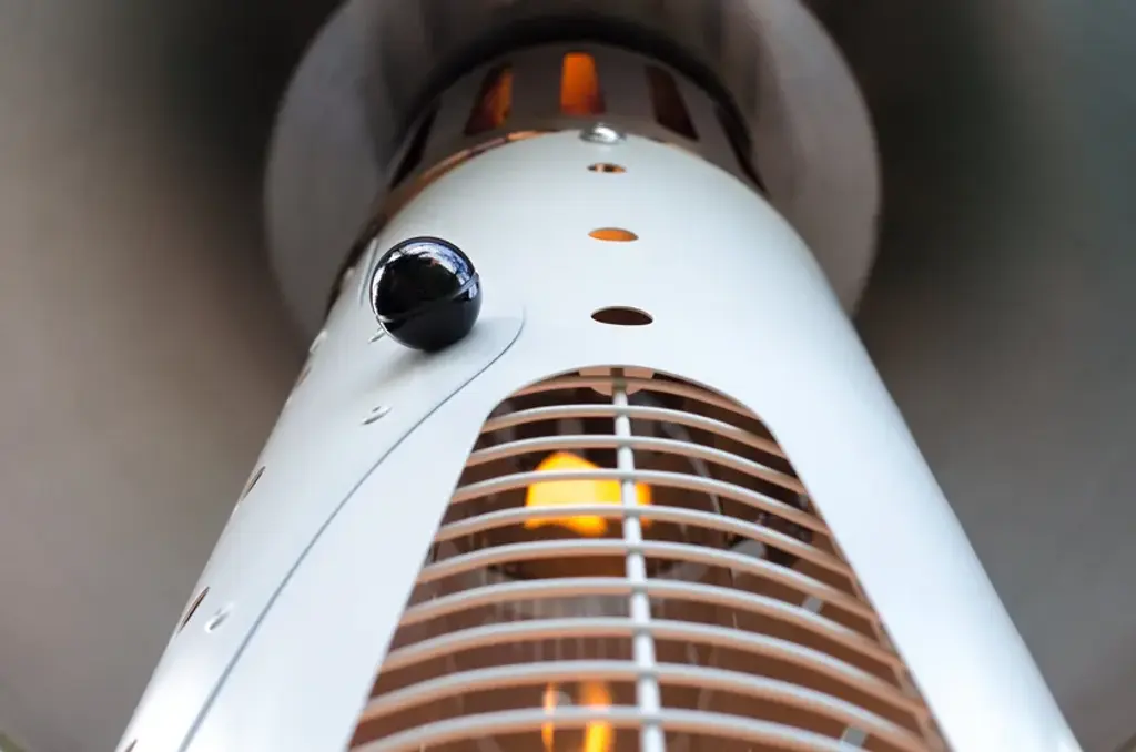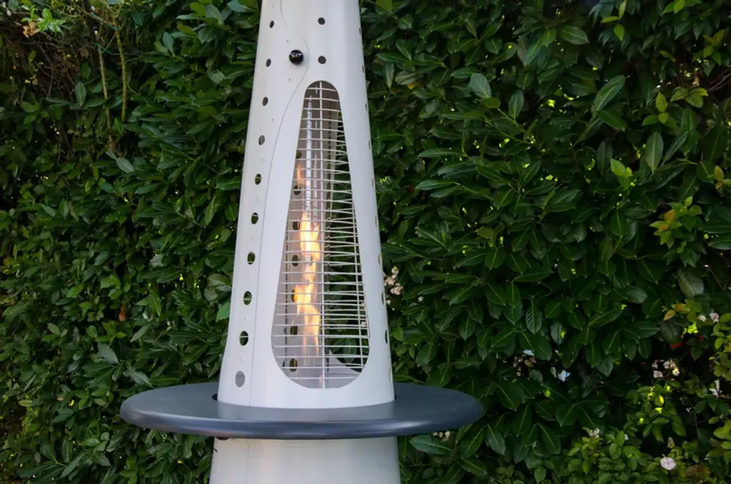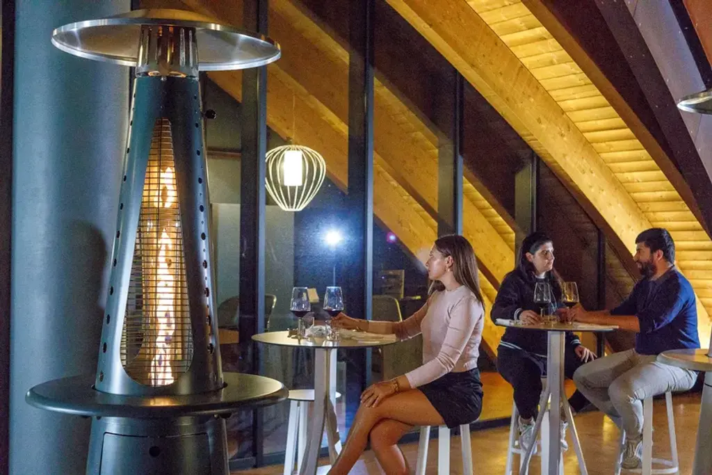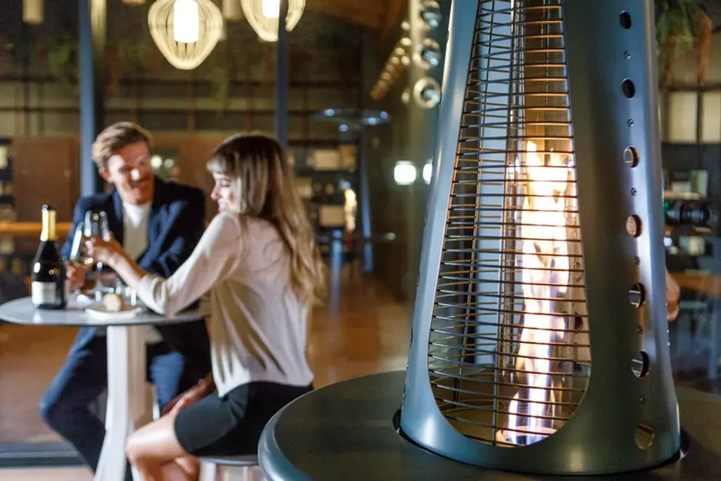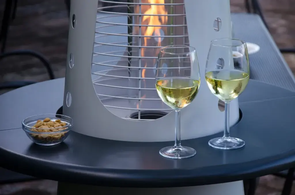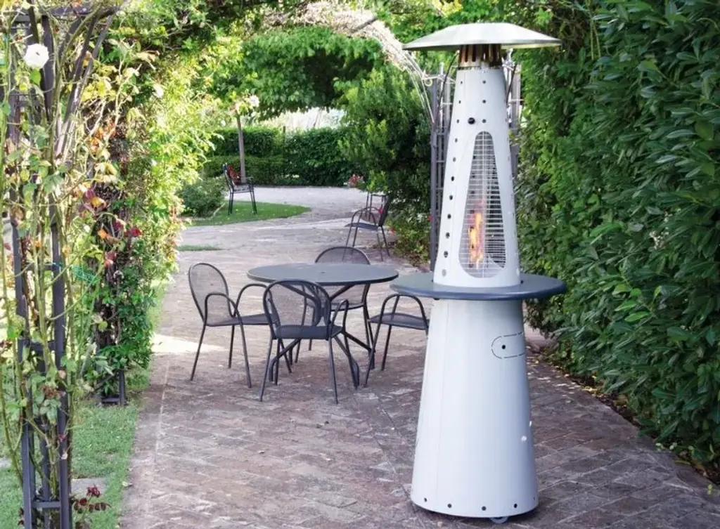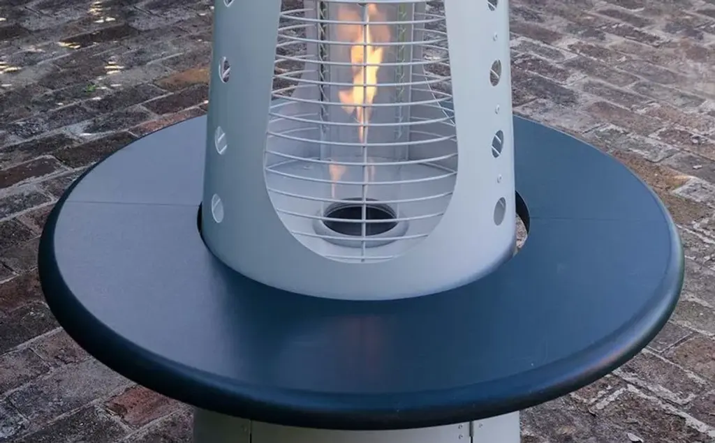 Hugfire Pro is an outdoor heating stove in painted steel with a movable, modern and design table for dehors. Suitable for outdoor environments, contract use and particularly suitable for the HO.RE.CA channel.Features:- Caloric power: 11 kw- Consumption: 800 g / h- Heated area: 20 sqm- Fuel: LPG (G30 / G31)- EC approval: EU Regulation 2016/426 and UNI EN 14543: 2017- Colors: Anthracite, FogHugfire is the outdoor heater to make a meeting of friends or customers a cosy, warm and shiny place in squares, courtyards and dehors interiors. The two-piece, easy-assembly steel body hides the LPG tank in its lower section, whereas the upper part whirls around itself hugging the flame so as to make it visible from every angle. A towering flame is hosted inside the pyrolytic glass tube, whose safety is ensured by protection grilles and dedicated, certified technological devices. Two elegant colours allow Hugfire to soberly fit in any setting, creating a wealthy mood that enlightens and warms conviviality, hospitality and sharing times.ConceptThe original idea was that of a mannequin whose open dress - a mere steel cone hugging and protecting the flame - featured a big aluminium hat refracting heat downwards for all the people around to cherish, be they standing or sitting on stools. A heater with a long dress almost brushing against the ground, giving a glimpse of its sturdy wheels for an easy use and handling. The cone-shaped silhouette is designed to house the fuel tank, leaving the flame in plain sight for everyone to enjoy light and warmth.Details:- The wide lower compartment, which can be accessed through a handy hatch, is designed to contain LPG tanks up to a 20 kg capacity while giving shelter to the burner body. - Protection grilles, coming with the same colour of heater’s body, provide for maximum safety degree and can be removed for maintenance routine. - The base built-in wheels and the knobs to be used as gripping points allow for easy handling by slightly tilting the heater. - The aluminium hat reflects the heat released by the flame downwards, thus creating optimum comfort in every environment.