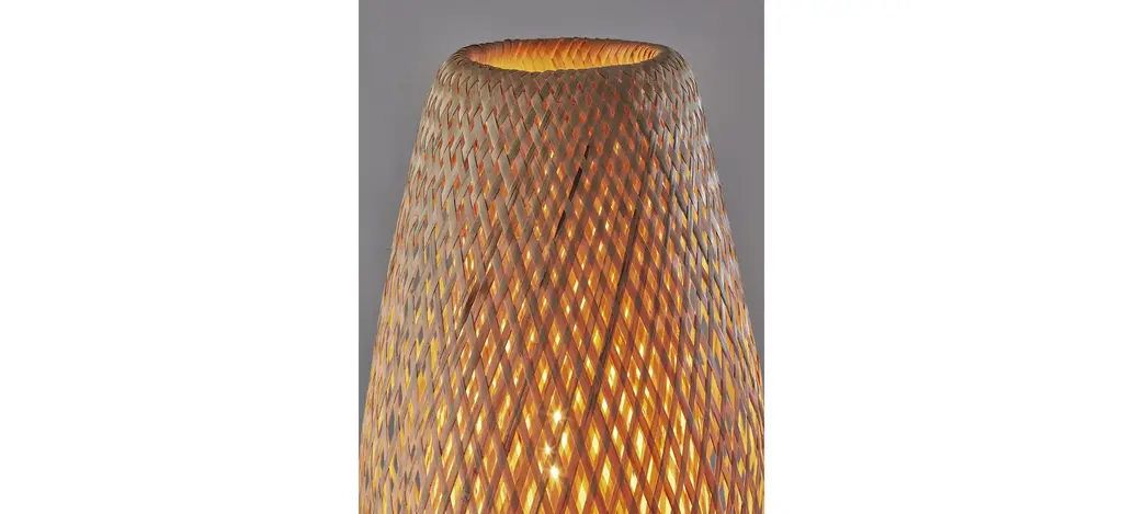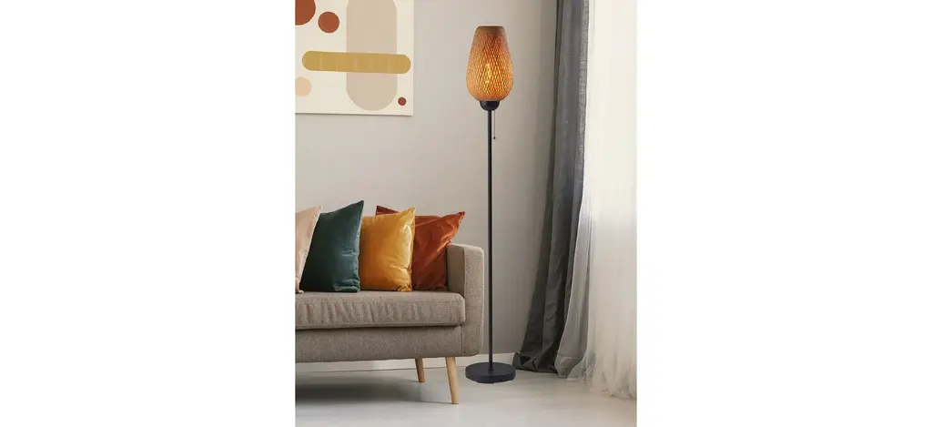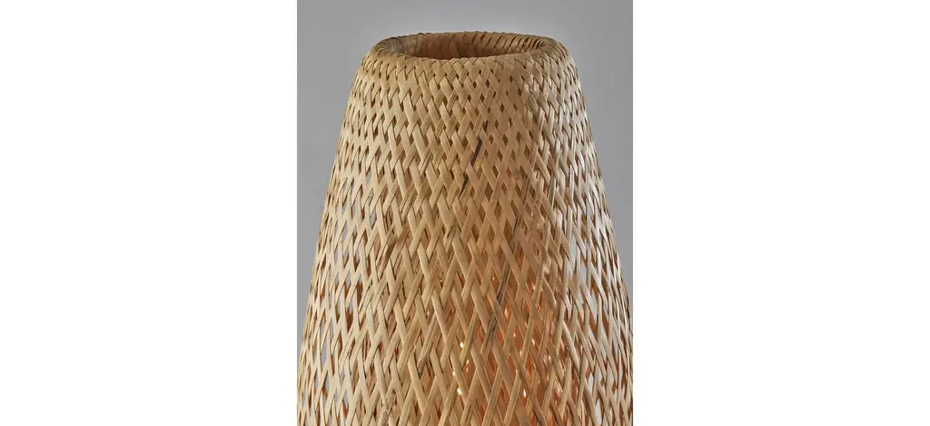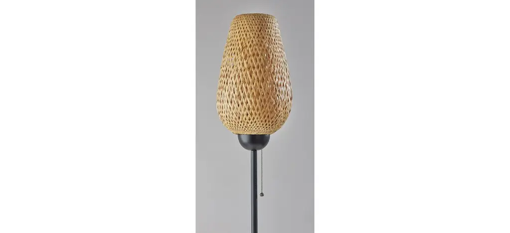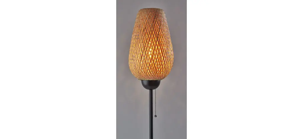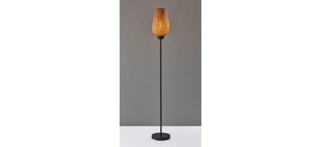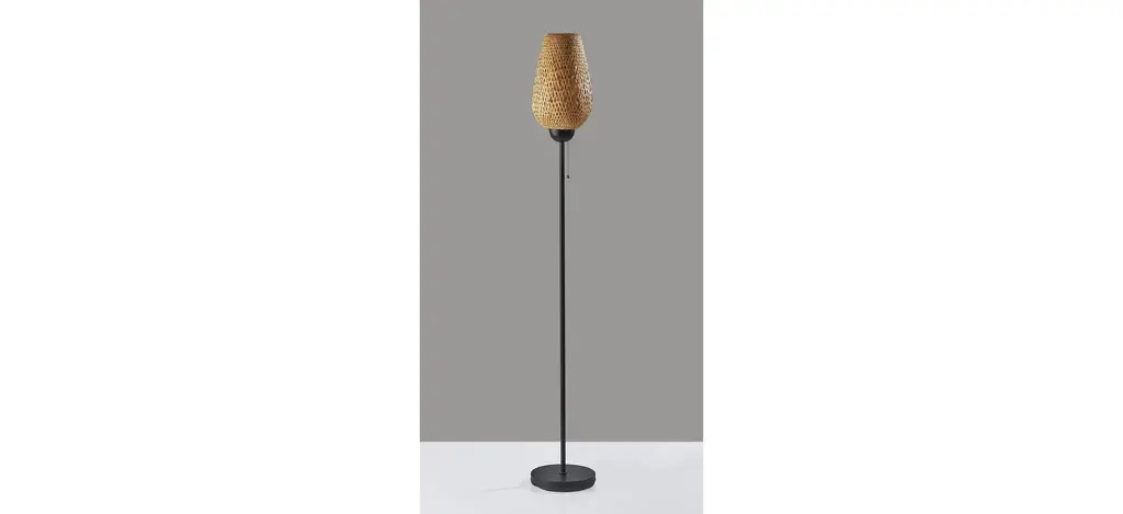 Bring beach-bungalow ambiance and a warm glow to your home with the 68.25" tall Hugo floor lamp. It features a 10" diameter round metal base in black finish supporting the matching tall and narrow tube-shaped stem. With an open-weave natural bamboo tulip-shaped shade distilling the light of a 60W bulb, this lamp creates a relaxed and natural focal point to any room. Operated by a pull chain located on the base of the shade to easily turn it on or off, the floor lamp also features a 6-foot black cord. Complete your space's look with the coordinating Hugo table lantern and pendant lighting.