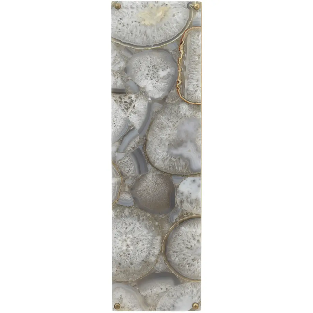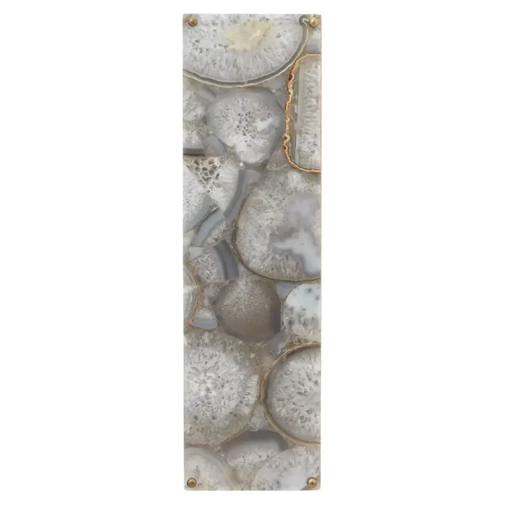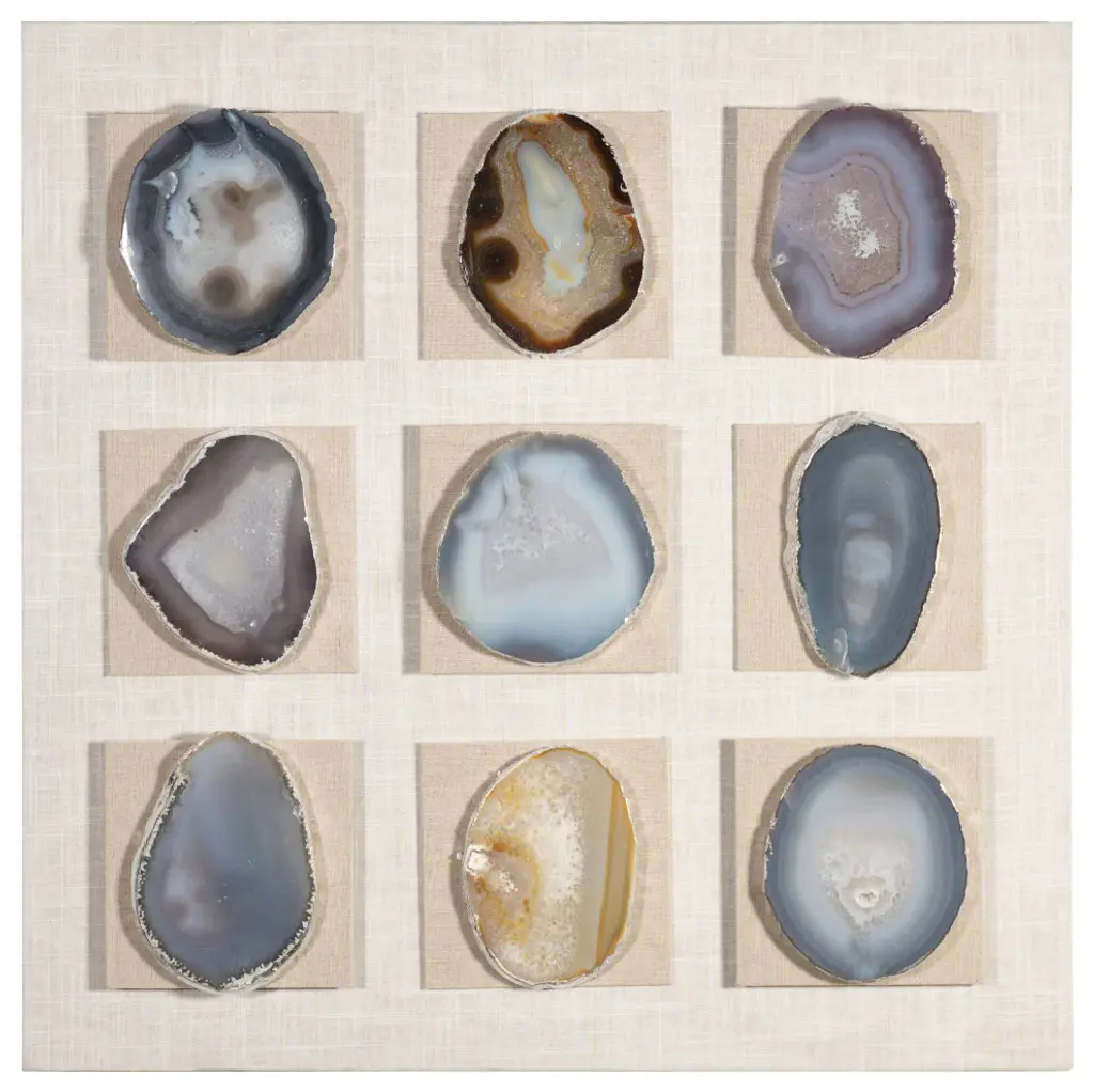 Bring home a touch of refinement with our Assorted Agate Slice Wall Décor. Agate is popular around the world for its natural beauty, some consider it a healing stone that possessed with cleansing effect. Nine kinds of natural agate pieces were cut and polished to perfection before placed on linen covered bases to fully expose their mesmerizing color and pattern. The edges of each agate slices were hand foiled in silver. We built this wall décor with durability in mind so you can display it on your wall or countertop for years, minimum maintenance required. With its fine craftsmanship and strong presence, it is ready to elevate any room to a new level of sophistication.Unlike anything mass-produced, this wall décor was hand crafted by our experienced in-house craftsmen using natural material. Every single one are unique and irreplaceable. Actual product may vary from the website picture. ONLY place order if accept this condition.
