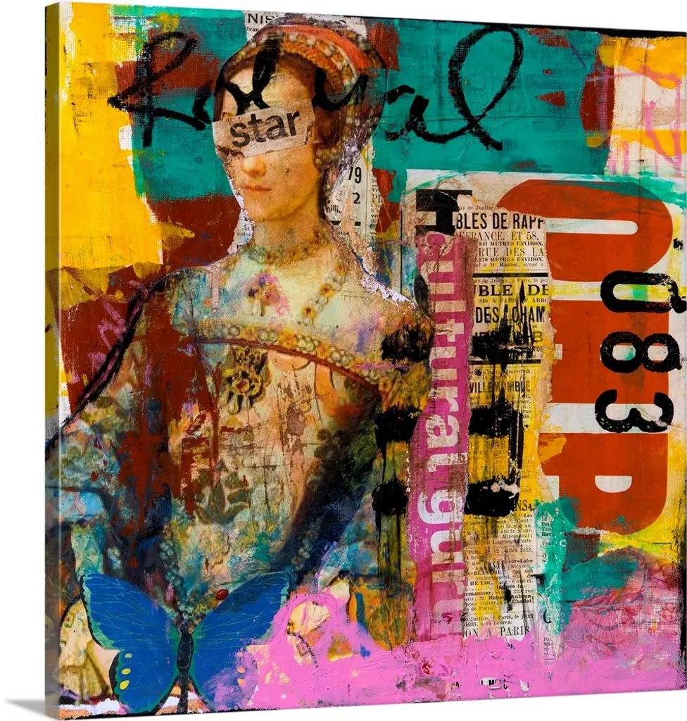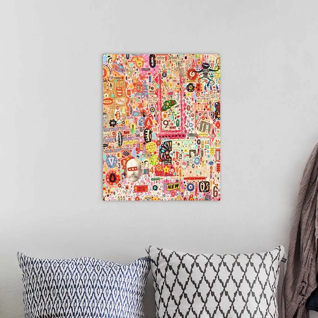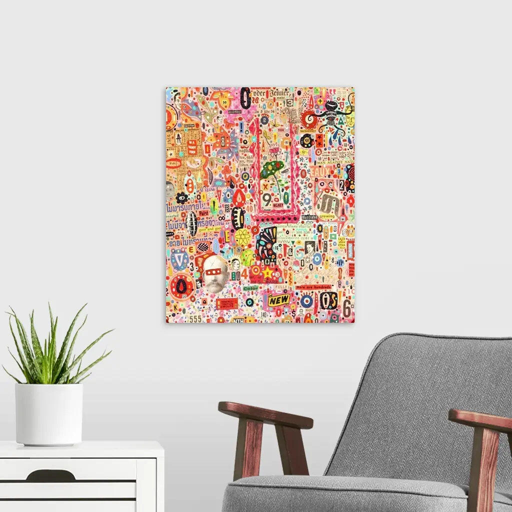 Mixed media abstract art with hundreds of found elements, including text, illustrations, and symbols.