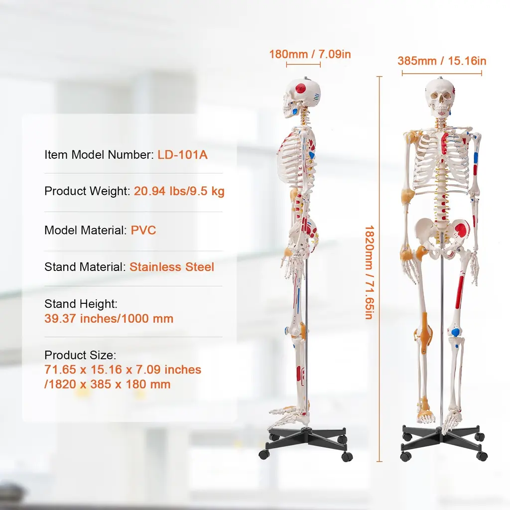 Experience Real Anatomy: Our 3D skeleton model brings the human body to life, allowing for an immersive exploration of its intricacies. Unlike traditional learning tools (like pictures, charts, and posters), this model provides a hands-on experience that boosts understanding and retention. Interactive Learning: Dive into the fascinating world of anatomy with our engaging anatomical skeleton. Designed for fun and interactive learning, it makes studying the human body an adventure rather than a chore. Detachable Design: Our anatomy skeleton features a detachable design that allows for easy assembly and disassembly, allowing students to observe and study human anatomy more intuitively. With sturdy construction, it stays firmly in place during demonstrations, saving it from slipping. Durable and Premium: Crafted from durable PVC material, our anatomical skeleton model is built to last and is easy to clean. High-quality colored components are precisely and clearly reproduced to mimic human structure and function, providing a more realistic learning and display experience. Versatile Usage: Perfect for students, professionals, and educators alike, our human skeleton model serves a variety of purposes. From classroom learning to clinical demonstrations, it provides a comprehensive solution for studying and showcasing human anatomy. Package Content 1 x Human Skeleton Model
