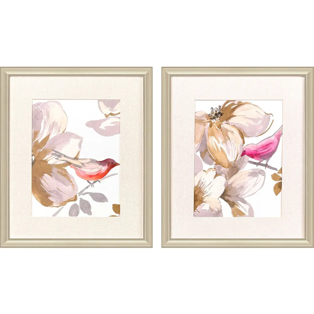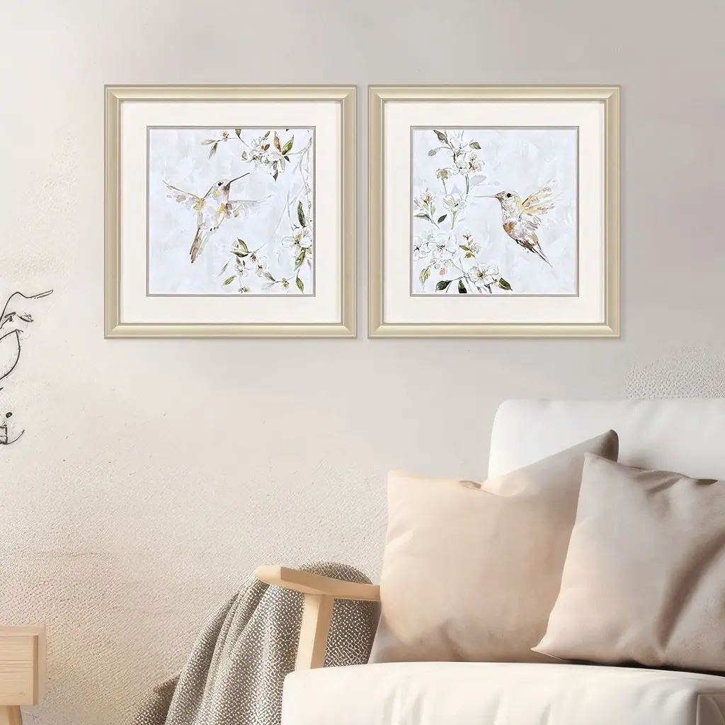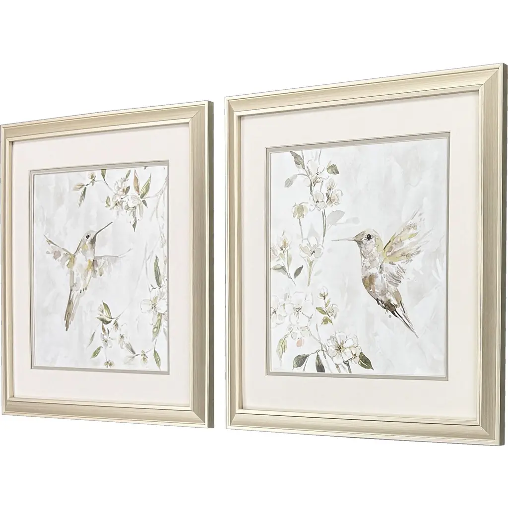 A set of two prints with delicate white hummingbirds are matted in light buff and pewter. They are framed in a champagne gold finish molding.