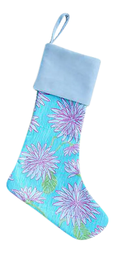 Custom-tailored Christmas holiday stocking made from designer Hunt Slonem's "Bunny Hutch" linen print fabric. Vintage solid cotton-velvet cuff and back. The stocking has an attached matching hanging loop. Please note: pattern placement on stocking may vary. Excellent new unused condition.
