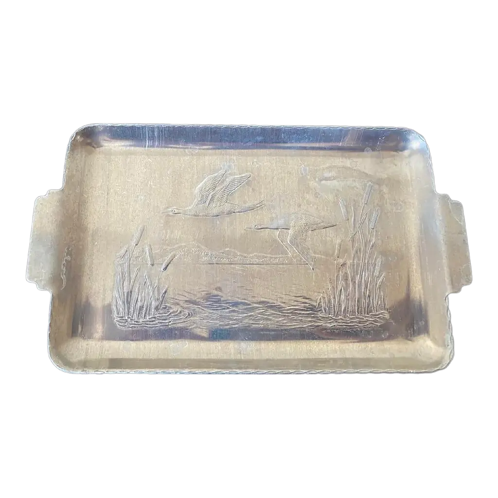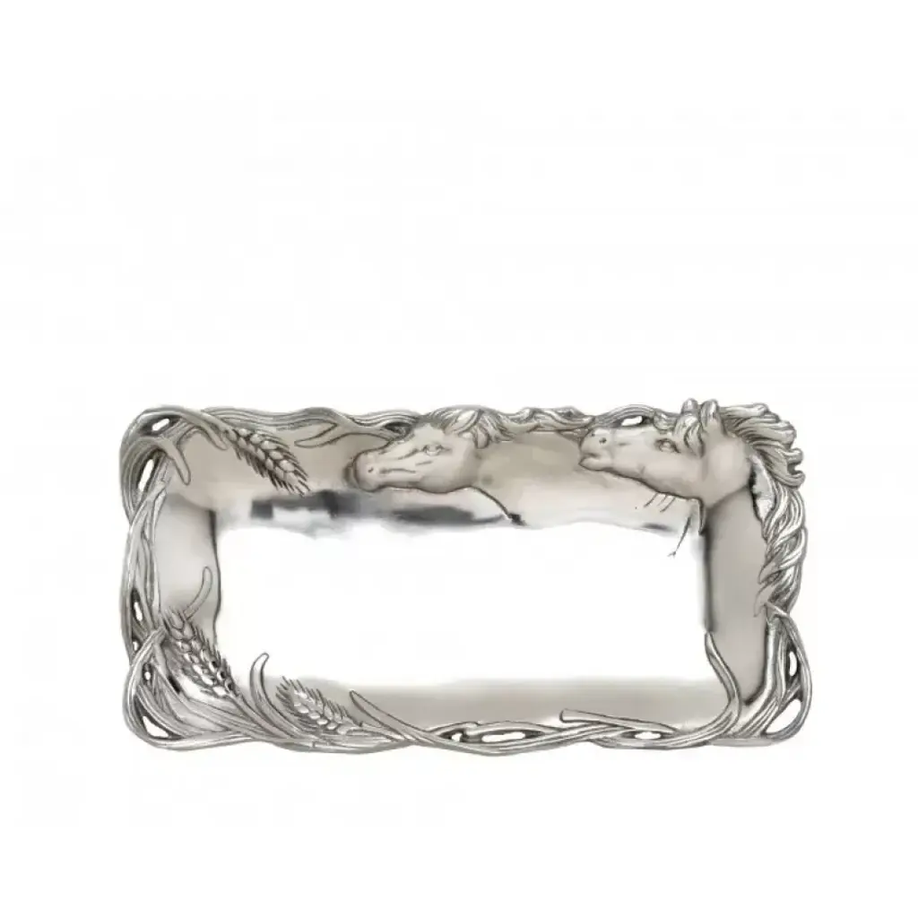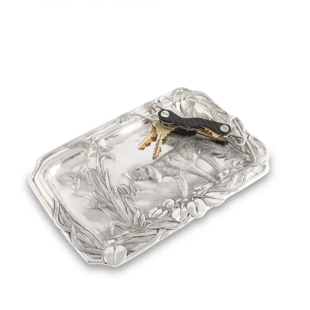 Introducing Vagabond House's Hunting Dog Catch All Tray, a stunning element from our Morning Hunt collection that defines rustic elegance. Meticulously crafted from the finest pewter, it displays an exquisitely detailed hunting dog, echoing the spirit of the wild. The substantial size securely accommodates your valuables like keys and jewelry, rendering it an essential home decor piece. It's more than a purchase; it's the best gift for luxury lodge style decor enthusiasts and a compelling luxury for fans of our unique morning hunt collection. Vagabond House is a family-owned American company specializing in fine pewter tableware, servingware and giftware. Largely inspired by nature, their exclusive products are designed to be unique, functional heirlooms for those who seek to express tradition and style in both family and formal entertaining.
