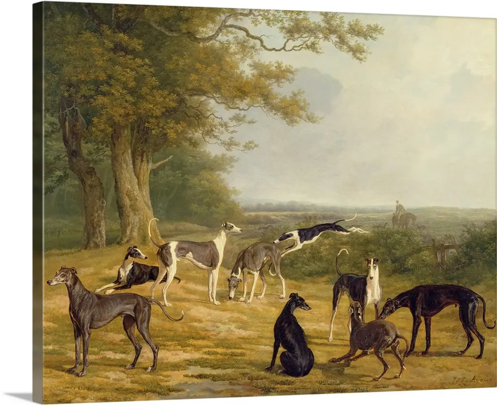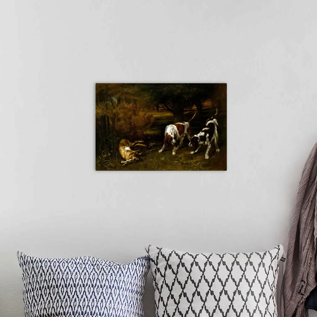 This picture dates to the same year that Courbet debuted his hunting scenes at the Paris Salon of 1857. It invites comparison to the slightly earlier?The Quarry?(Museum of Fine Arts, Boston) which includes the same pair of hunting dogs, accompanied by a dead stag instead of a hare. The present work was apparently described by the German painter Otto Scholderer (1834-1902), whose studio was above the one Courbet rented in Frankfurt in the winter of 1858-59. Scholderer noted that Courbet painted the dogs and the landscape from memory but modelled the hare from life.�