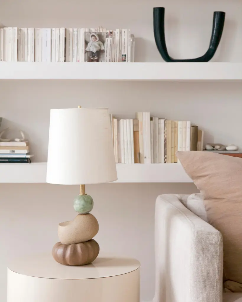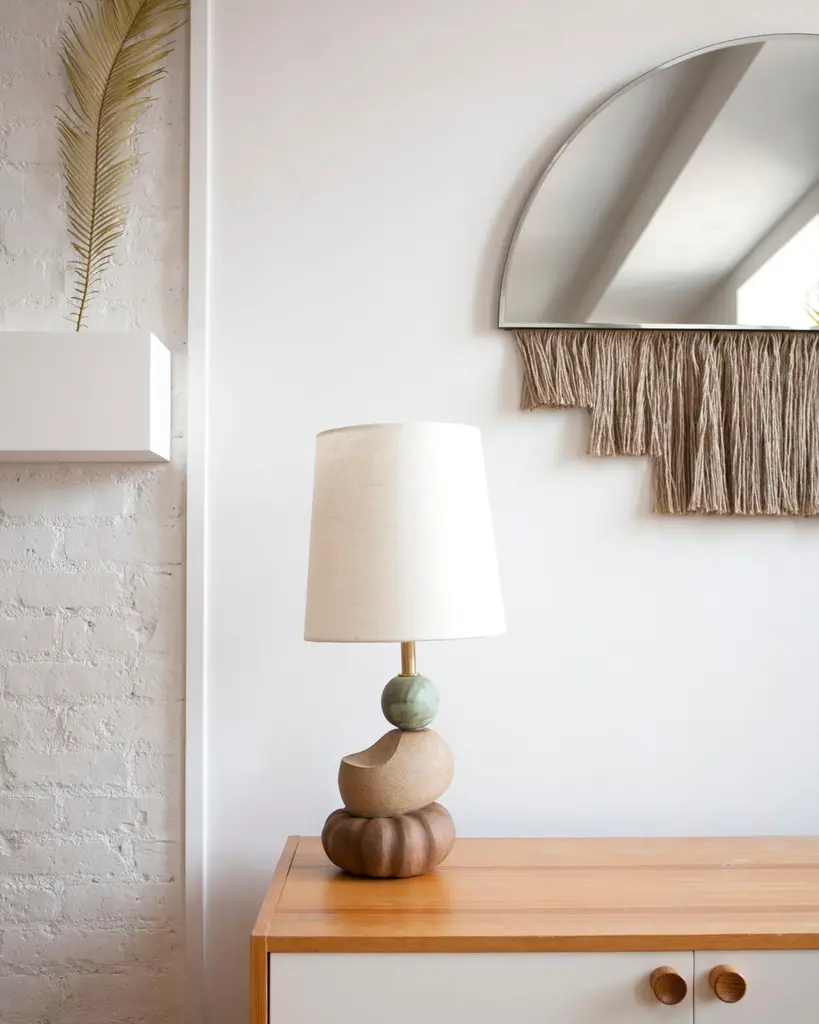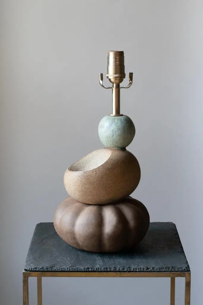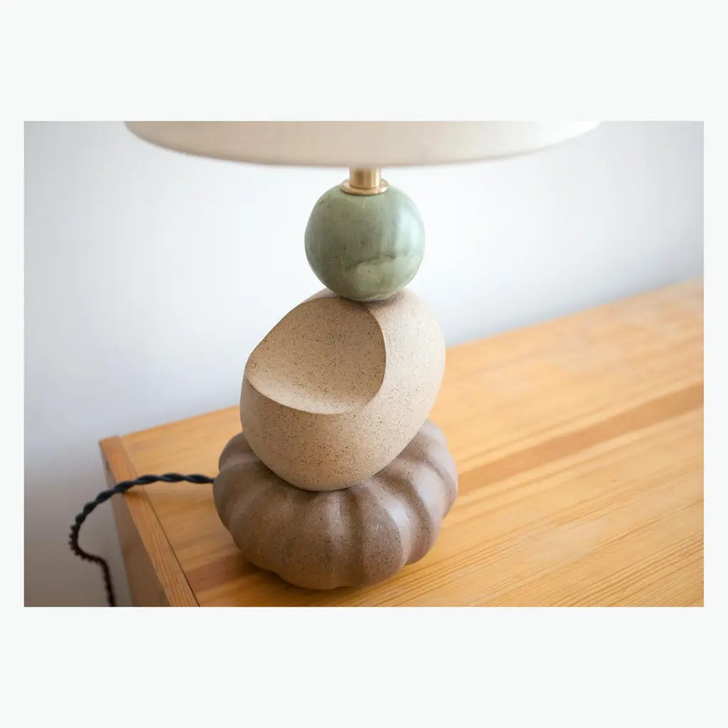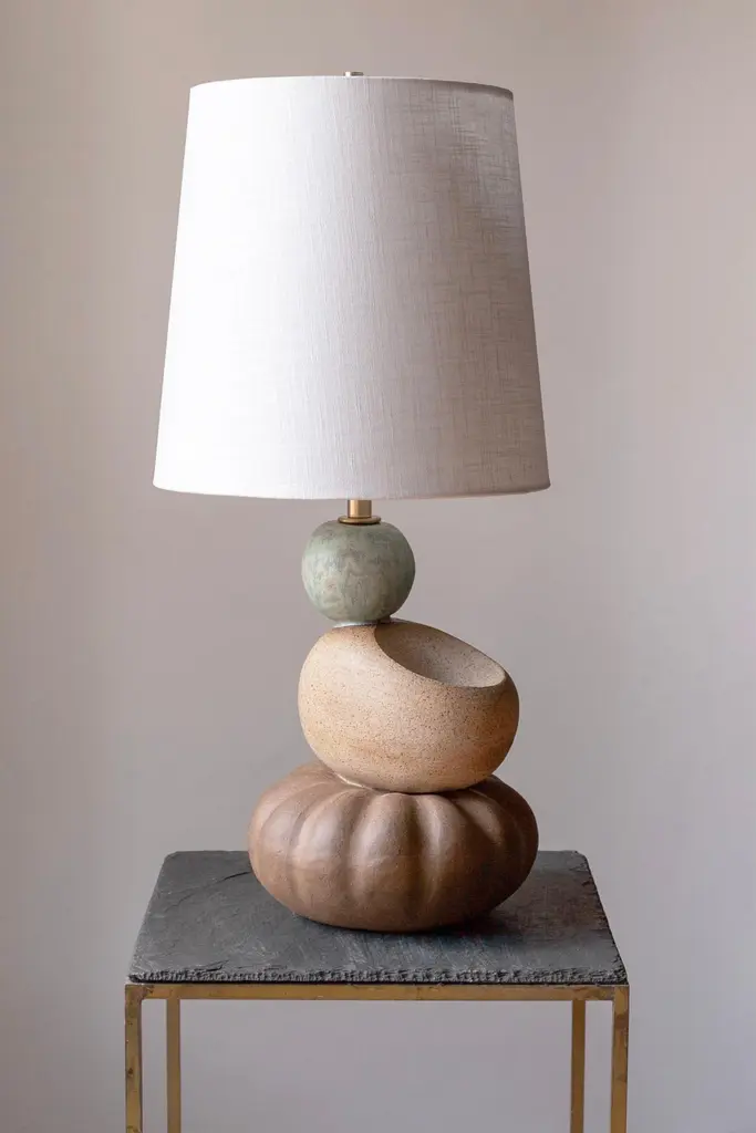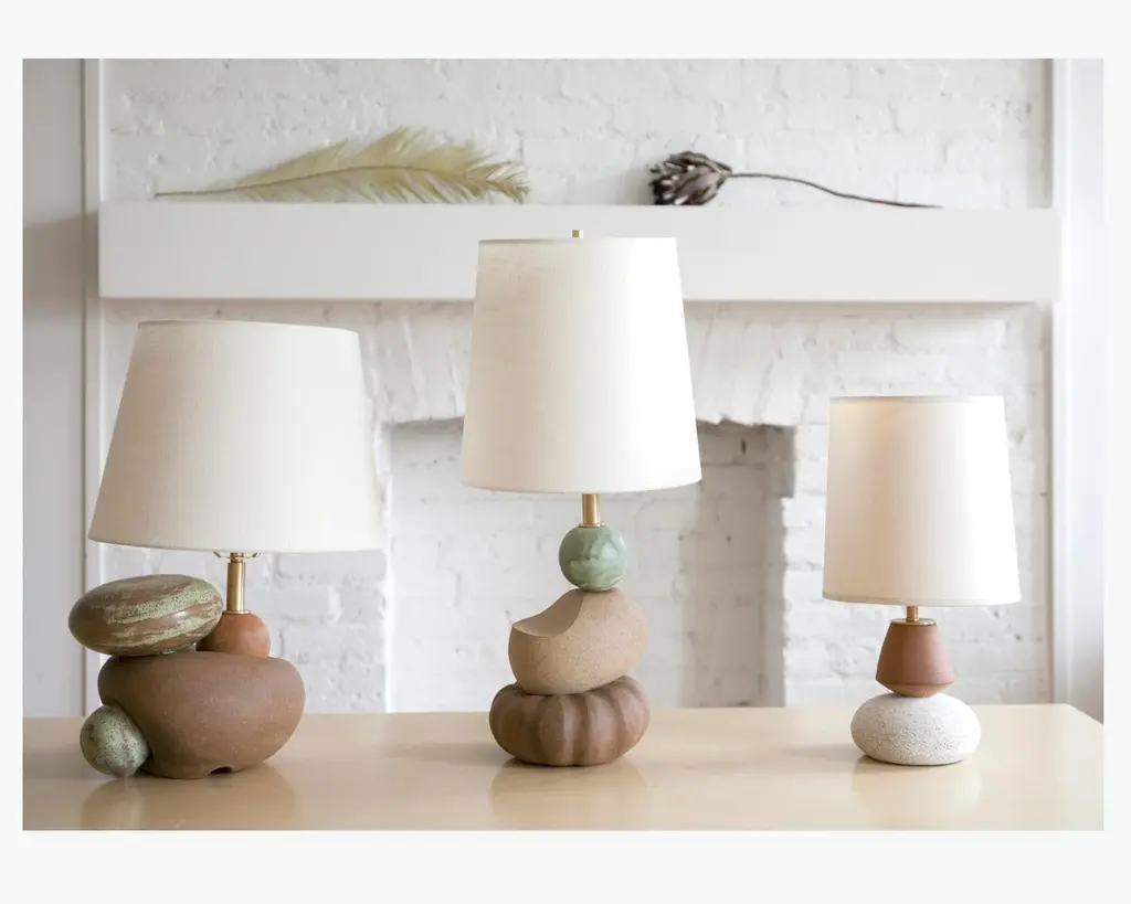 Sculptural Handcrafted Ceramic Huron Table Lamp with Linen ShadeThis one-of-a-kind lamp is a sculptural composition of hand-thrown and hand-assembled ceramic forms. Each stacked element is crafted in stoneware and finished with custom glazes that highlight the natural textures of the clay — from earthy matte brown to speckled sand to soft blue-green marbling. The interplay of rounded, organic shapes evokes both balance and movement, making the lamp as much a work of art as it is a source of light.The piece is completed with unfinished brass hardware and a pale blue braided cord, subtle details that heighten its modern elegance. Topped with a handmade linen shade, the lamp stands at approximately 23 inches tall.One-of-a-kind hand-thrown ceramic baseStoneware with custom glazes in brown, sand, and blue-greenUnfinished brass hardwareBlue braided cordHandmade linen shadeA collectible design object, this lamp embodies the spirit of contemporary studio ceramics — functional, sculptural, and timeless.Details:Lamp plugs into 120v outletMaximum 60-wattsRecommended to use with GE Soft LED series bulbsE-26 Medium base socket, 3 way turn keyDimmer available upon requestUL Listing available upon request at extra costStamped by Michelle McLaughlin of Calyer CeramicsDimensions:Base Height: 12.0"Base Diameter: 8×8”Shade Diameter Bottom: 10.0"Shade Diameter Top: 8.0"Shade Side Height: 10.0"Cord Length: 10'Overall Height: 23.0"