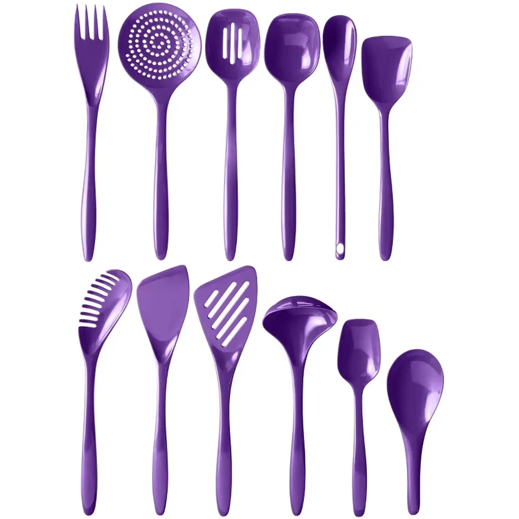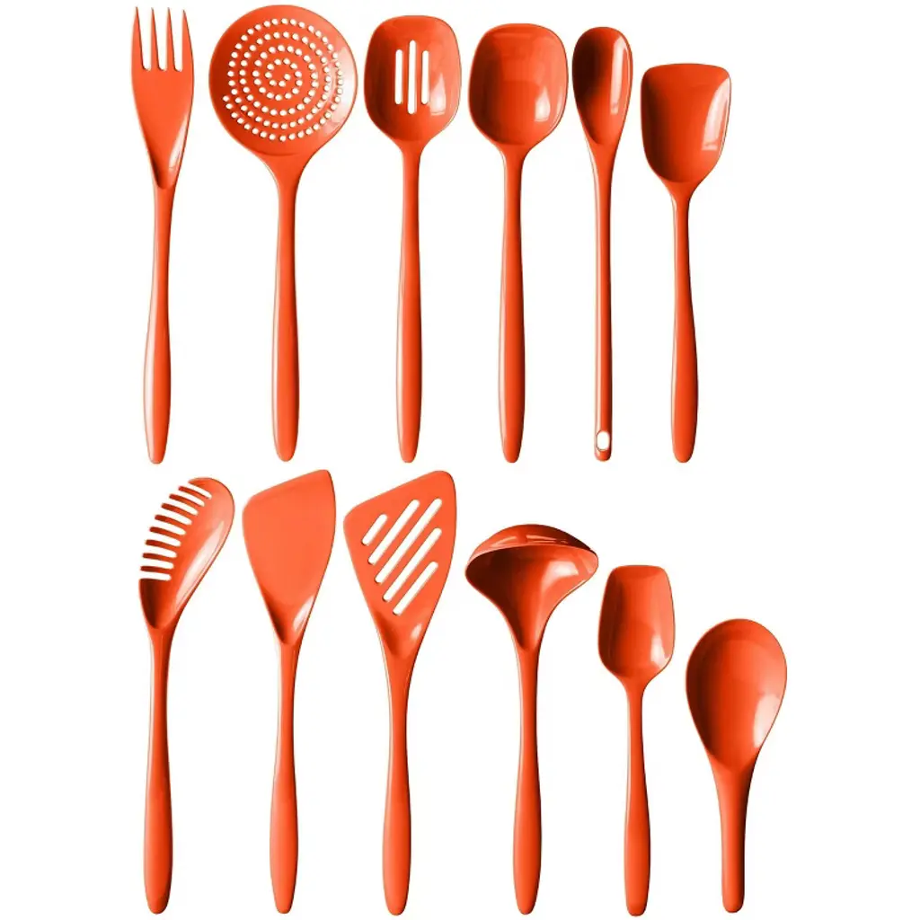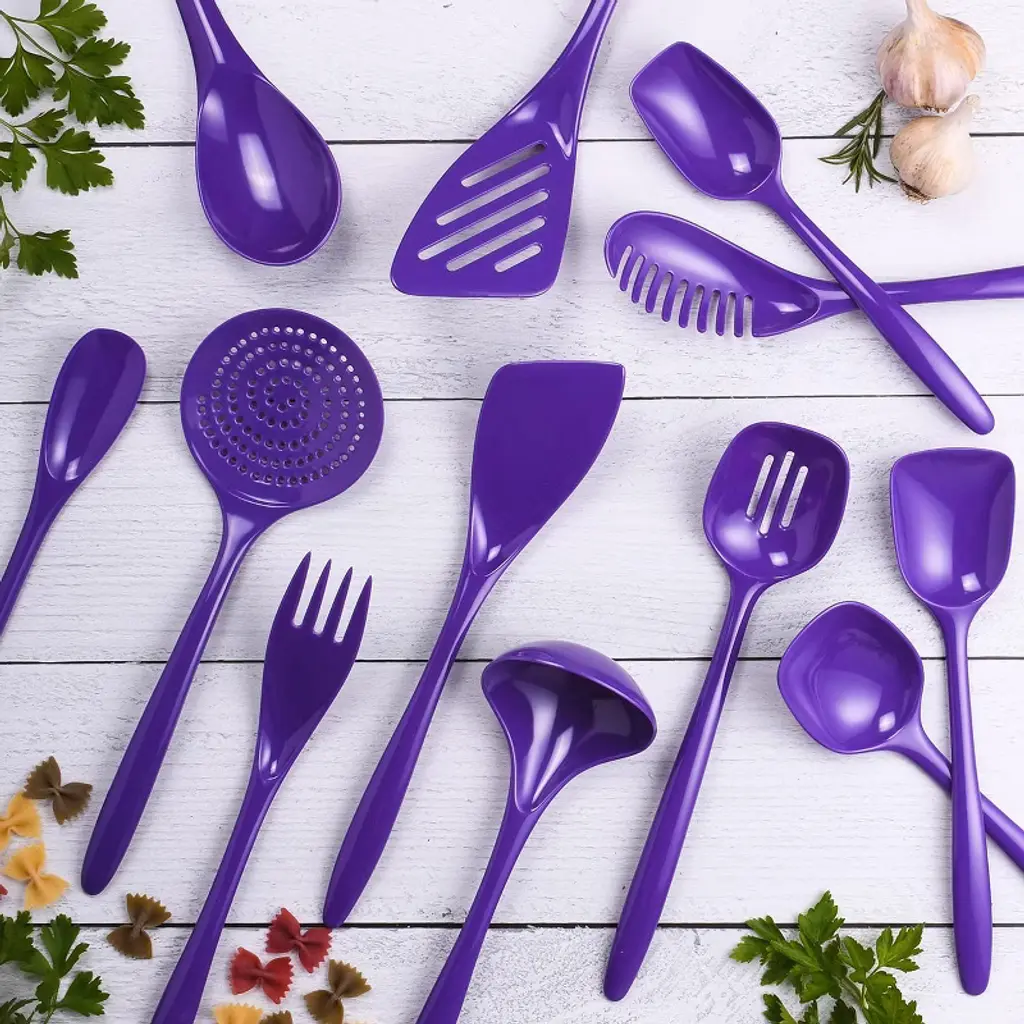Made of the highest quality melamine, these award-winning utensils are perfect for both cooking and serving.The set includes all 12 full-sized utensils, each of which performs a specific function in the kitchen, in addition to serving.Rice/Wok Spoon, 8.25"Spoon, 10"Flat-Front Spoon, 11"Soup Ladle, 11"Spoon, 12"Fork, 12.5"Turner, 12.5"Slotted Spoon, 12"Skimmer, 12.5"Pasta Spoon, 12.5"Slotted Turner, 12.5"Mixing Spoon, 12"With no holes in the handles, they look great on the table and are comfortable in your hand when using them. Safe for use on your best nonstick cookware and heat-resistant to 360°F.They feature a permanent glossy shine and are made of strong and durable melamine.Made in Thailand. Dishwasher safe, BPA free.