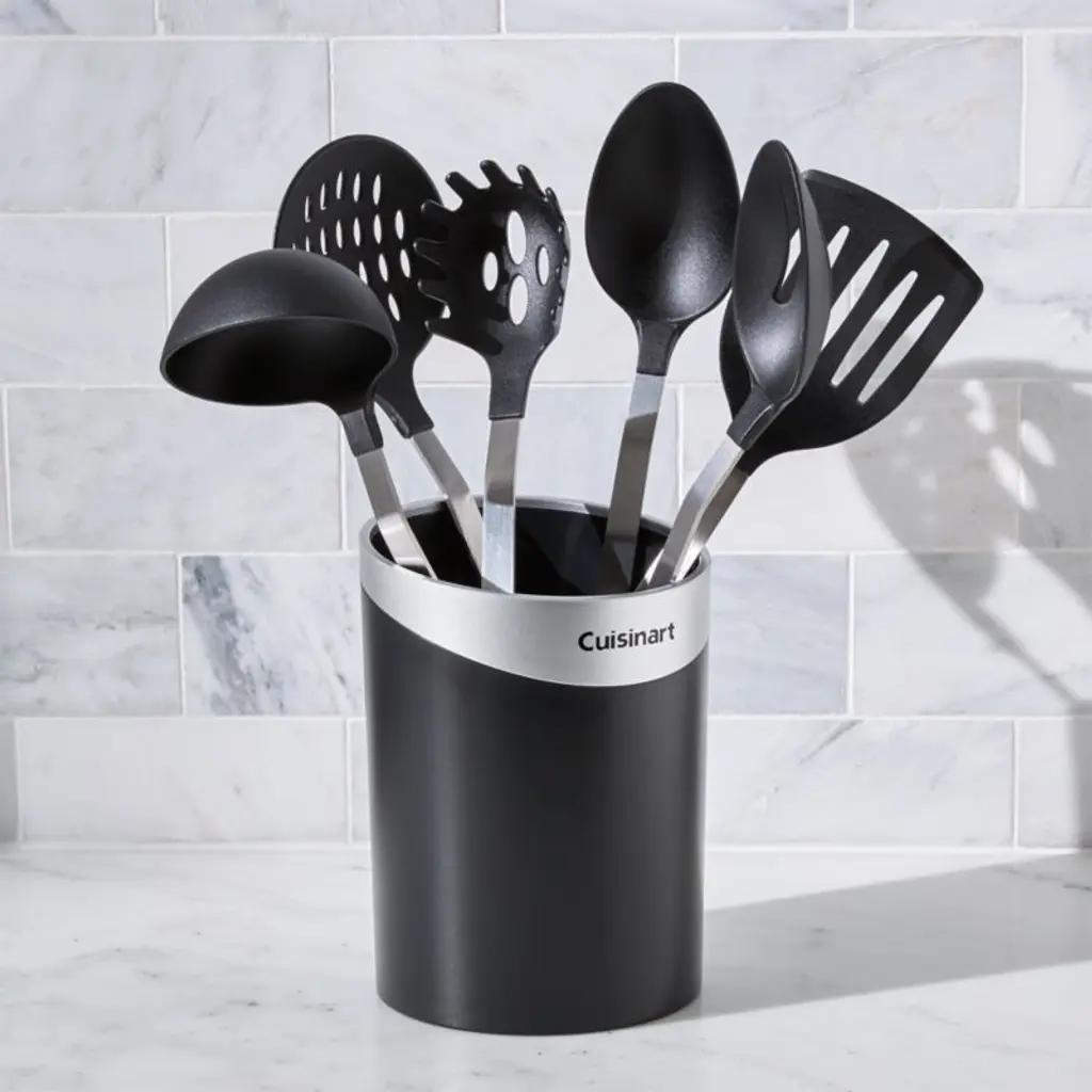 This great set includes 5 melamine cooking utensils and a stylish color-matching storage crock. Each utensil has all the features you expect from Hutzler: dishwasher safe, heat resistant, safe on nonstick cookware, and permanent shine.The 6-piece set includes: a 12-inch slotted spoon, a 12-inch cooking spoon, a 12-inch mixing spoon, a 12.5-inch slotted turner, an 11-inch soup ladle, and a color-matched Storage Crock for conveniently storing all the utensils in.All utensils are safe on your best nonstick cookware and are heat-resistant to 360 degrees F. Made of high-quality BPA-free melamine, these tools are strong and durable, lasting for years and maintaining their permanent glossy shine. Made in Thailand. Dishwasher safe.