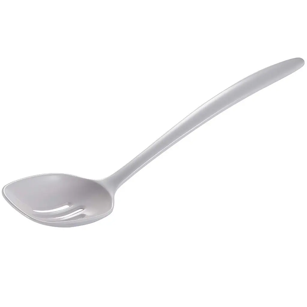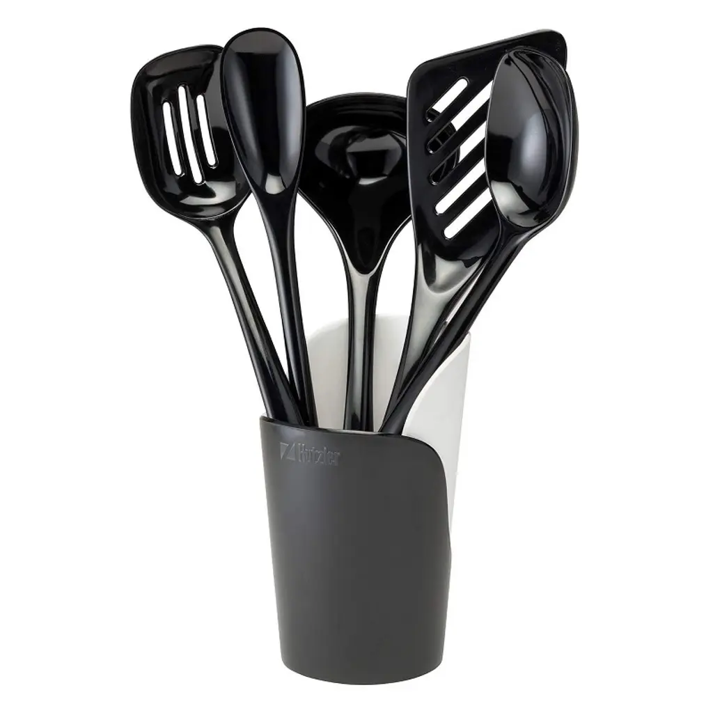 This great set includes 5 melamine cooking utensils and a stylish color-matching storage crock. Each utensil has all the features you expect from Hutzler: dishwasher safe, heat resistant, safe on nonstick cookware, and permanent shine.The 6-piece set includes: a 12-inch slotted spoon, a 12-inch cooking spoon, a 12-inch mixing spoon, a 12.5-inch slotted turner, an 11-inch soup ladle, and a color-matched Storage Crock for conveniently storing all the utensils in.All utensils are safe on your best nonstick cookware and are heat-resistant to 360 degrees F. Made of high-quality BPA-free melamine, these tools are strong and durable, lasting for years and maintaining their permanent glossy shine. Made in Thailand. Dishwasher safe.