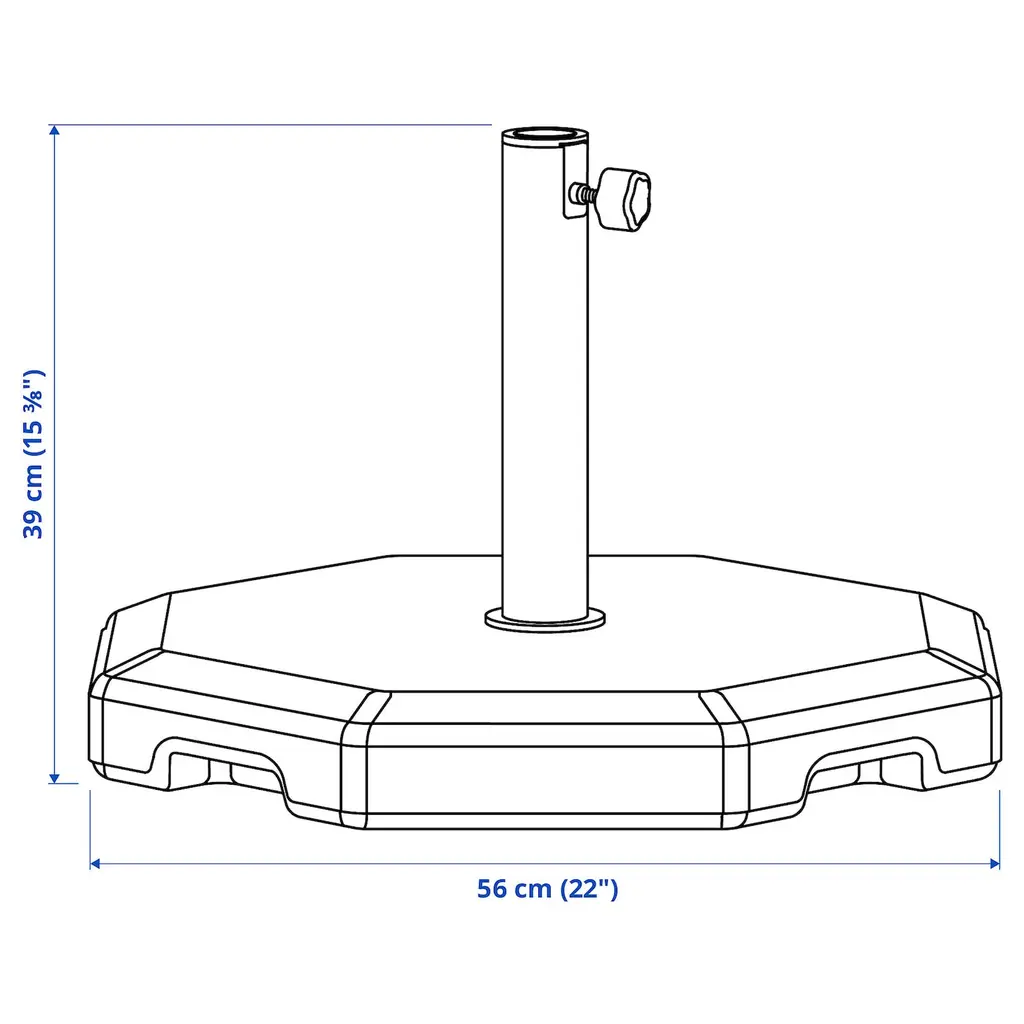 HUVÖN Umbrella base - gray 22x22 ". Even large umbrellas remain stable in the heavy base. The cut-out handles under the parasol base make it easier to move. Fits the following parasols: JOGGESÖ, LJUSTERÖ and HÖGÖN.