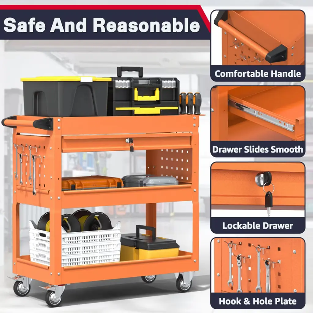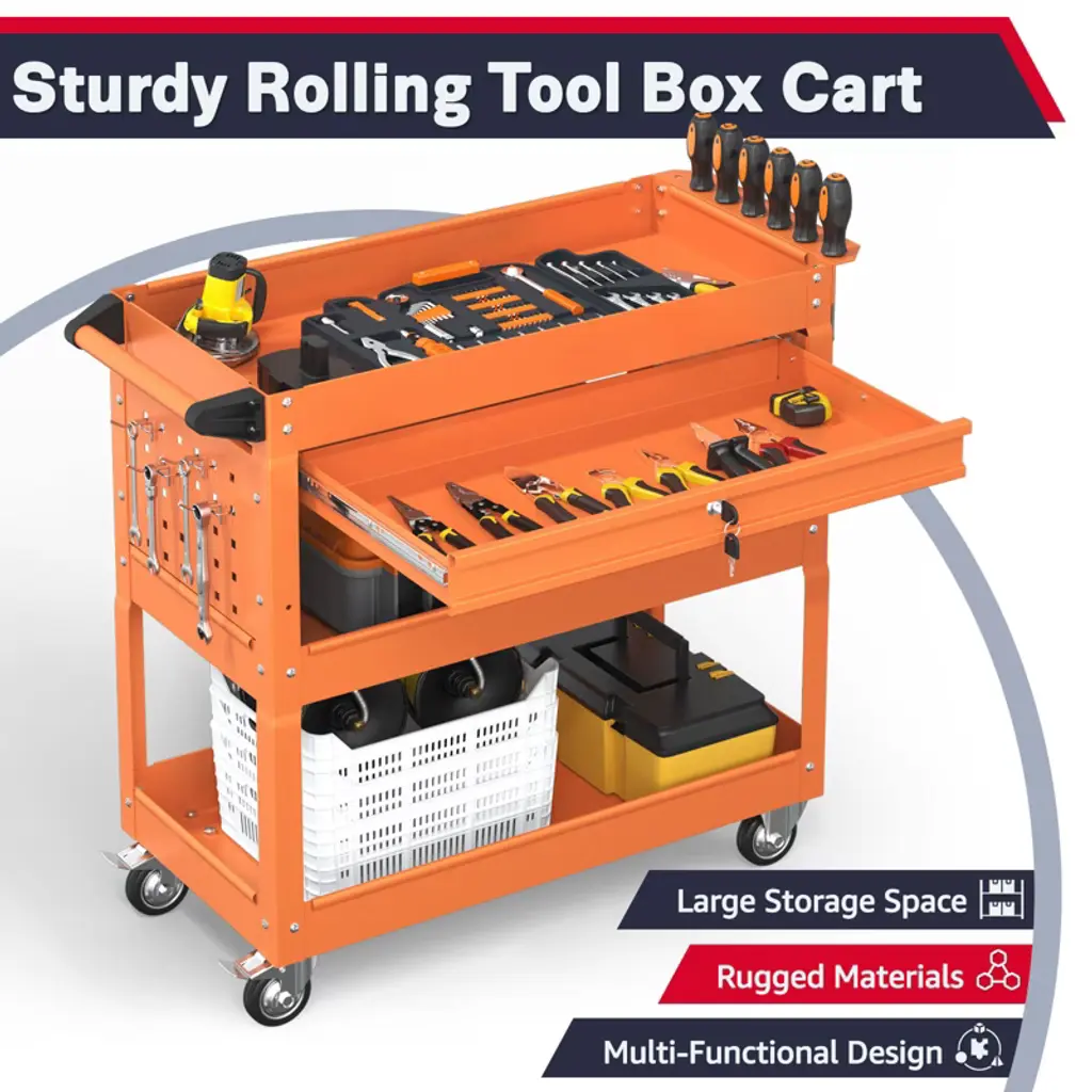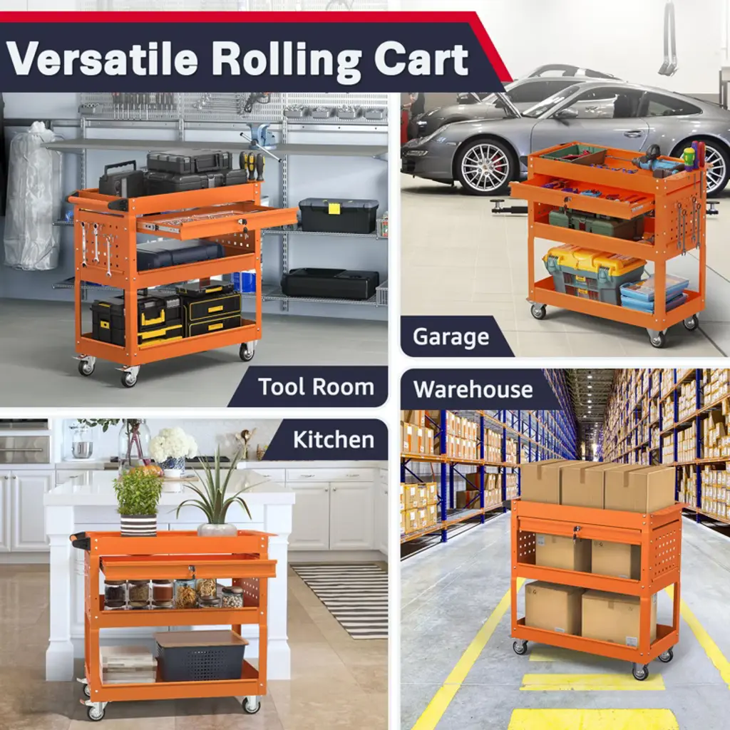 Huxxion 3-tier Rolling Tool Cart On Wheels, Heavy Duty Mechanic Tool Cart With Drawers, Utility Cart For Workshop Garage Warehouse(orange)