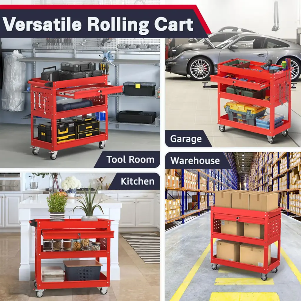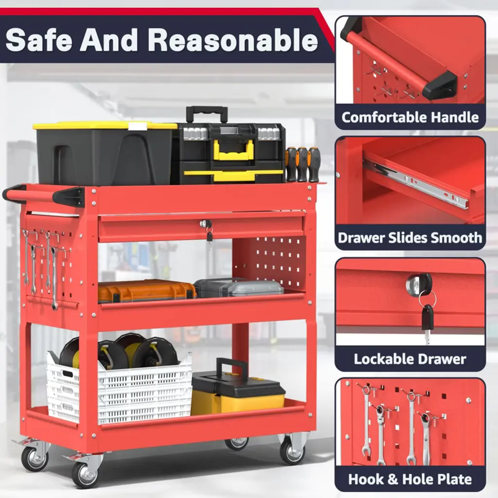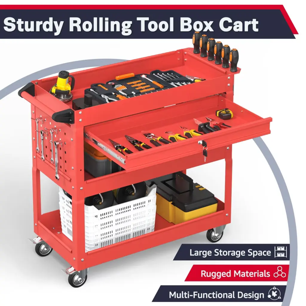 Huxxion 3-tier Rolling Tool Cart On Wheels, Heavy Duty Mechanic Tool Cart With Drawers, Utility Cart For Workshop Garage Warehouse(red)