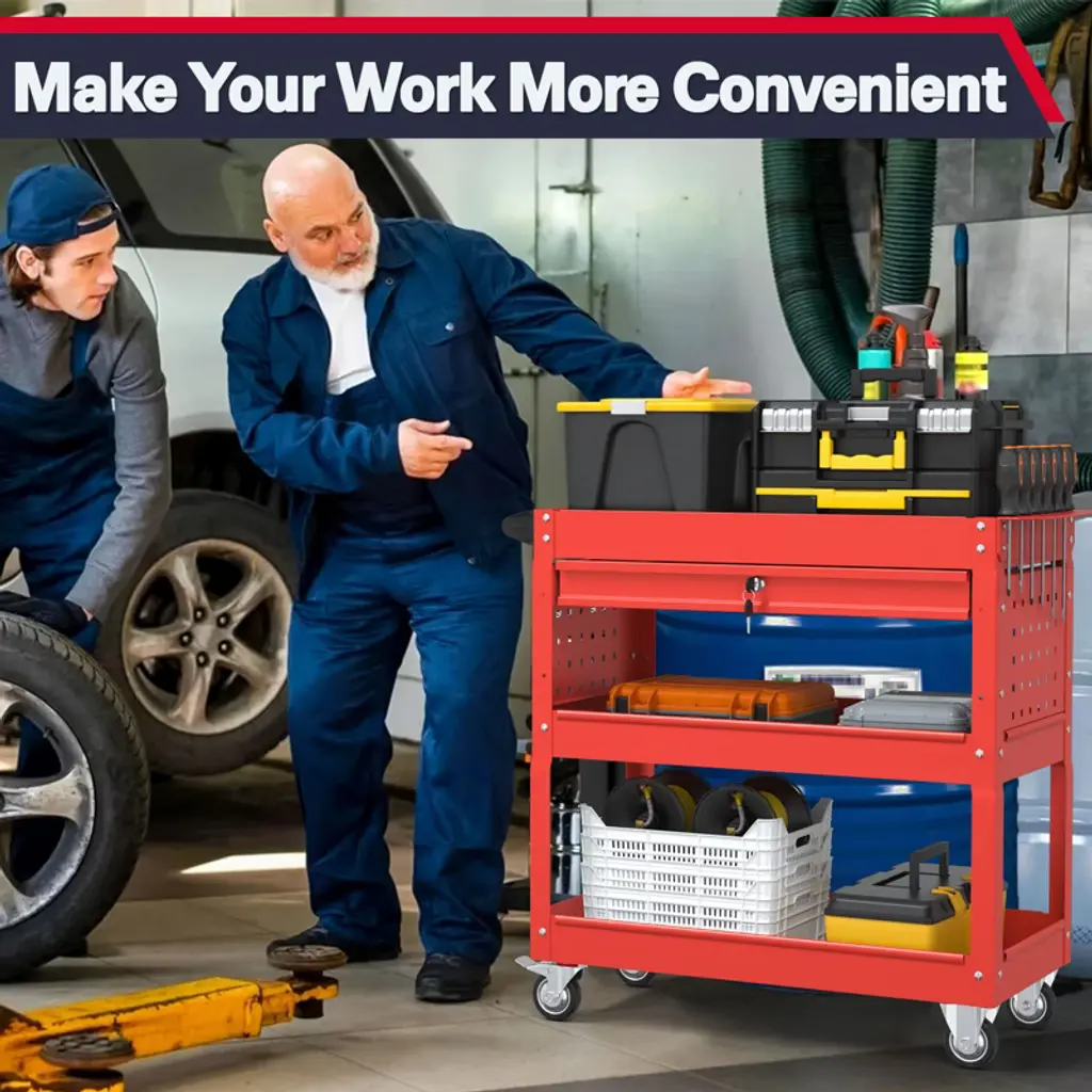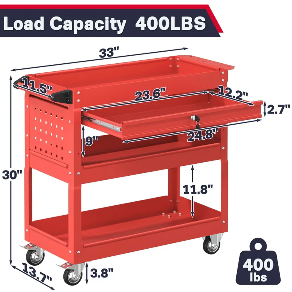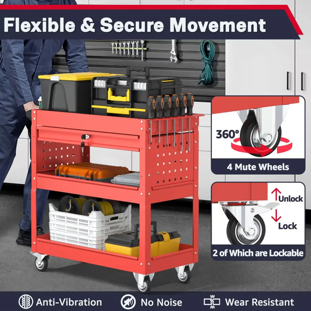 Huxxion 3-tier Rolling Tool Cart On Wheels, Heavy Duty Mechanic Tool Cart With Drawers, Utility Cart For Workshop Garage Warehouse(red)
